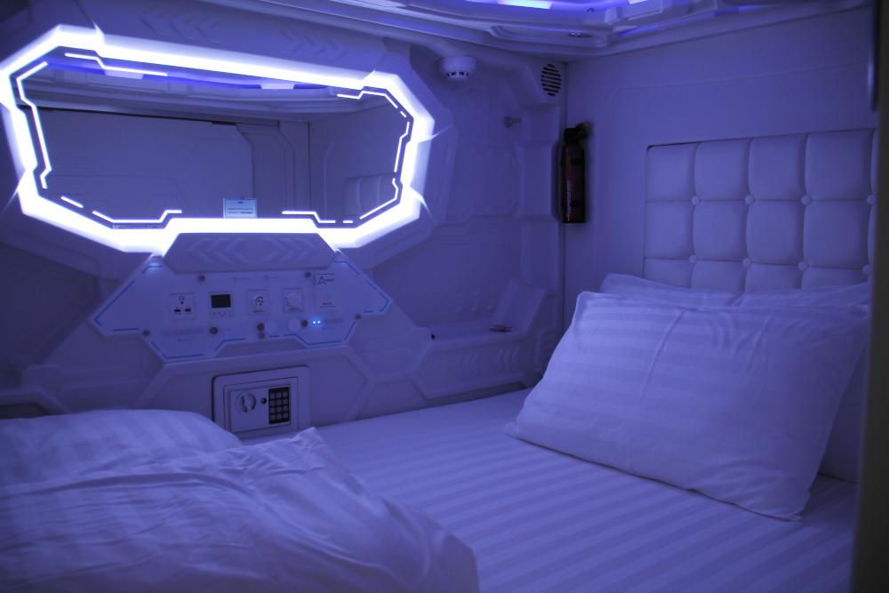 Koska lentoni lähti jo neljän jälkeen aamulla, katsoin parhaimmaksi yöpyä mahdollisimman lähellä lentoasemaa. Siinä olisi kyllä voinut lojua yön lentokentän lattiallakin, koska tuossahan joutui heräämään kahden aikaan yöllä, mutta yöunet ovat nykyään minulle aika tärkeä juttu ainakin töissä käydessä. Löysin majoituksen lentoaseman sisältä, kun varasin paikan kapselihotellista alle 50 eurolla. Olen aiemmin majoittunut kapselihotellissa Tokiossa, mutta tämä Suvarnabhumin kokemus oli todellisempi kapseli ja aika futuristinen ratkaisu. Mielestäni se oli aivan nerokas ja tällaisia saisi löytyä kaikkialta. Yllätyin kun majoitus sijaitsi lentokentän käytävällä, jossa oli viiden kapselin ja säilytystilan rakennelma. Olin sentään odottanut ihan semmoista liiketilaa, johon mentäisiin sisälle ja jossa olisi majoituskapseleita. Tämä oli kuitenkin mahtavan kätevä kyhäelmä, siisti ja hyvät unet siellä sai. Varmasti aion jatkossakin käyttää aamulentojen kanssa!