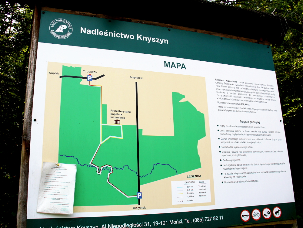 Juuri ennen Bialystokia pysähdyimme yli tunniksi ja kävimme kävelemässä metsässä. Suwalkista 114 km päässä sijaitseva Rezerwat Przyrody Krzemienkan luonnonsuojelualue. Pääsimme sinne kääntymällä 8-tieltä asfaltoidulle tielle, jonka merkitsin tähän linkkiin >>. Siinä oli tien varrella sitten ihan levike opastetauluineen. Myös 8-tien varrella on ikään kuin levike, josta pääsee samoille poluille, mutta siihen olisi ollut aika vaikea pysähtyä rekkaliikenteen keskellä.