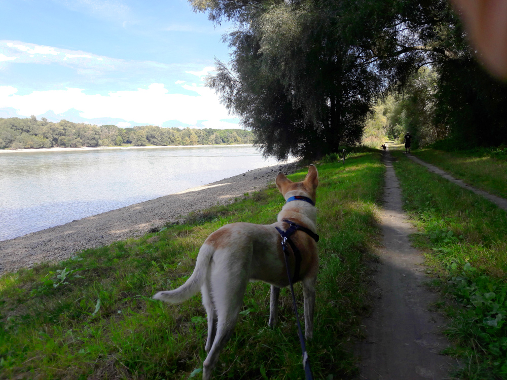 Ajoreitti Bratislavasta Wienin suuntaan menee aikalailla Tonava-Auenin kansallispuiston ohi ja halusimme käyttää tämän vierailumahdollisuuden hyväksemme, koska en löytänyt muitakaan koirien kävelytyspaikkoja tuon päivän ajomatkan varrelle. En oikein saanut kaivettua Wienin seudulta tietoa Wiener Waldissa kävelemisestäkään eikä google mapsin katunäkymät toimi Itävallassa varmaankaan jonkinlaisista yksityisyydensuoja-asioista johtuen. Tämä hankaloitti muutenkin Itävallassa reissaamista, koska google mapsin katunäkymiä tiiraillen voisi etukäteen saada varmuutta sen suhteen onko joku tie liian jyrkkä tai kiemurainen meidän matkailuautollemme. Nyt me saimme näitä tietoja yhdestä karttakirjastamme, jossa on merkitty sellaisia teitä, joille ei kannata lähteä matkailuvaunun kanssa (silloin ei kannata lähteä meidän matkailuautollakaan), ja lisäksi vanhempani ovat osanneet kertoa monista teistä.