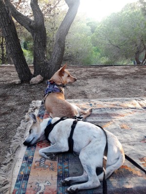 Oli oikein kiva päästä Espanjaan, sitä jotenkin rentoutui viimeistään tässä vaiheessa matkaa. Muutenhan minua on stressannut matkanteko. Stressaavia tekijöitä ovat olleet autosta, koirista ja suunnistamisesta huolehtiminen. Autot ovat minulle vähän sellainen mörkö, koska en ole koskaan omistanut sellaista, joten semmoisen huolto ei ole tuttua. Tämä matkailuauto on aika iso ja on hieman jännittänyt sen kestäminen. Koirista huolehtiminen on sitä, etteivät ne pääse luikahtamaan auton ovesta ulos, että onko niillä kaikki hyvin ja ettei missään nurkan takaa säntää vastaan joku vapaana jolkottava murre, jonka kanssa tulisi tappelu. Suunnistamisen stressi on mm. sitä ettei vain jouduttaisi liian jyrkille teille tai ihan vain käännytä jossain monimutkaisessa liittymässä väärästä kohdasta niin, että joudumme ajamaan 20 km ennenkuin tieltä pääsee kääntymään pois. Minua ovat hirvittäneet kapeat tiet ja tiukat kulmat, joihin pakostakin joutuu kaupungeissa ja kylissä leiriytymään mennessä. Muutenhan olemme koittaneet pysyä poissa asutuskeskuksista.