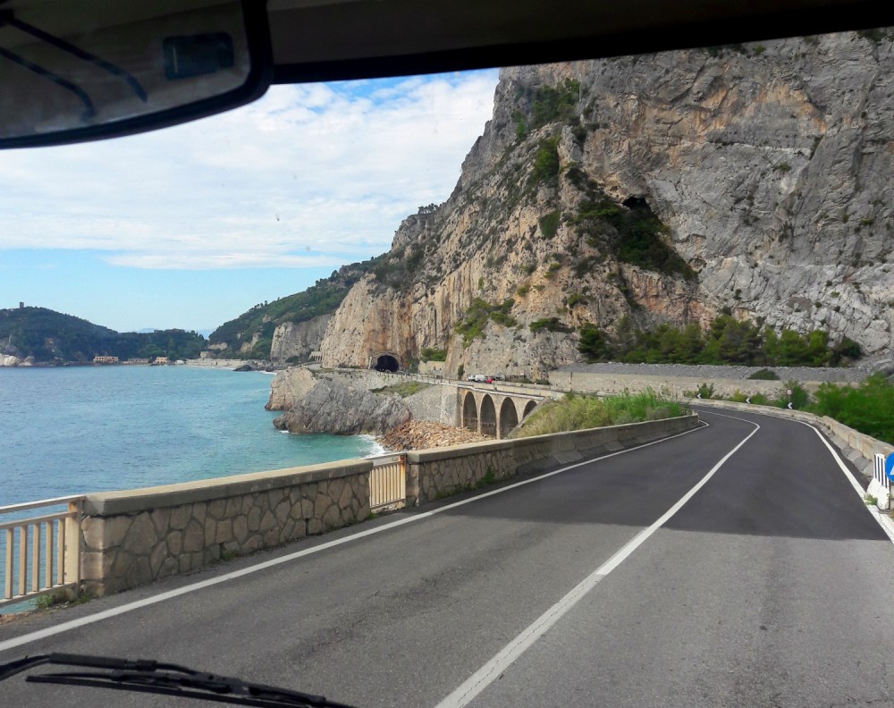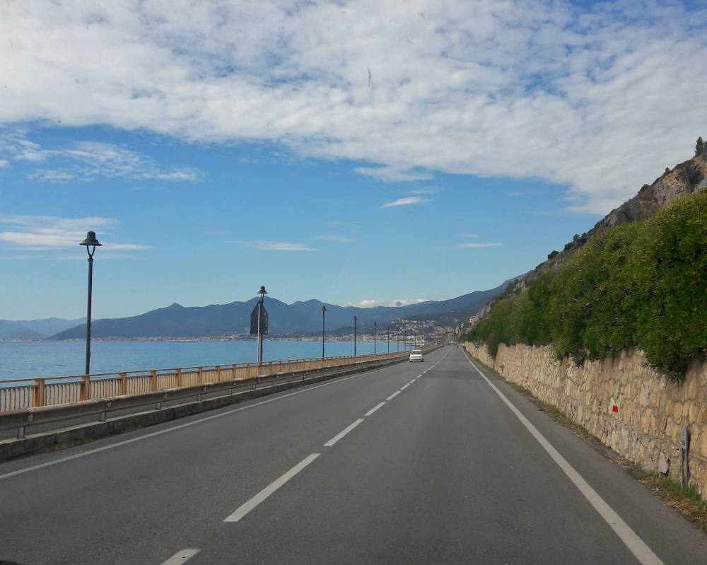 Ajoimme Gardajärveltä suoraan Välimerelle asti, vaikka harkinnassa oli jäädä leiriytymään sisämaahan jonnekin puoliväliin. Siellä ei ole juuri valinnanvaraa, joten Valmilana Camping olisi ollut ainoa vaihtoehto. Leirintäalueita löytyisi Apeniinien vuoristossa Piacenzan, Parman ja Modenan sekä Välimeren välillä, mutta sinne emme halunneet lähteä seikkailemaan teille, joiden vaikeusasteista meillä ei ollut tietoa. Valitsimme reitiksi Brescia – Piacenza – Tortona ja siitä E25-tietä Välimerelle ohittaen Genovan siten kauempaa kuin mitä A7-tietä olisi joutunut. Maisemat eivät olleet erityisiä, lähinnä peltoja, mutta eipä kuski edes pahemmin pääse maisemista nauttimaan ajaessaan.