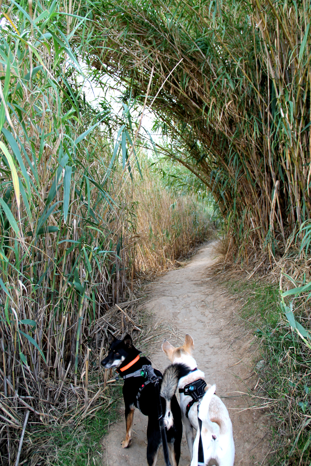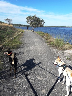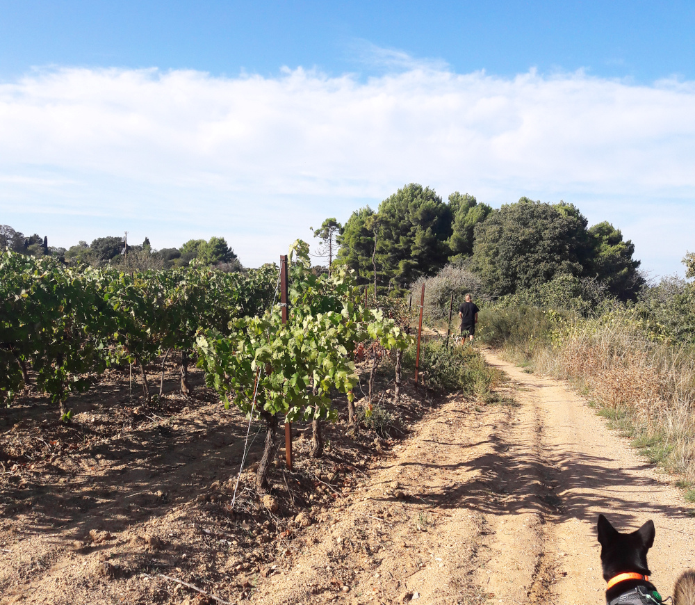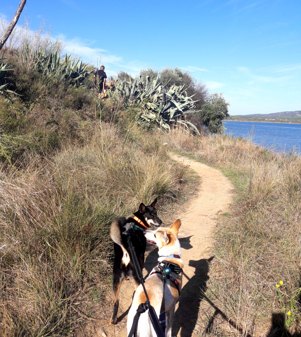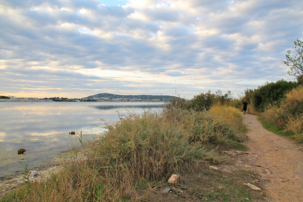Bouziquesissa oli Camping Lou Labech ja siellä oli onneksi meille tilaa, vaikka paikka vaikuttikin suositulta. Taas pääsimme paikkaan, jossa leirintäalueen ja järven tai meren välissä kulki kävelypolku, jolla oli hyvä ulkoiluttaa koiriamme. Järven rannalla useimmissa kohdissa oli levää, mutta löysimme koirille pulahduspaikkojakin. Rantapolku oli siten vaihteleva, että välillä oltiin rantakaislojen siimeksessä ja välillä oli aloeta ja viinipuskia, välillä mäntyjä ja hiekkarantaa.