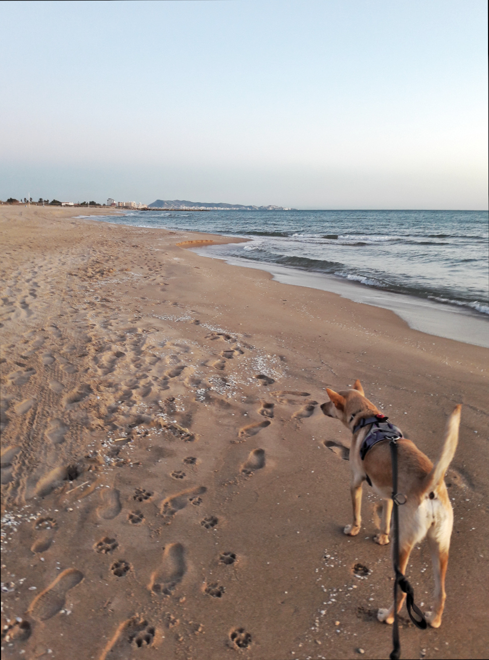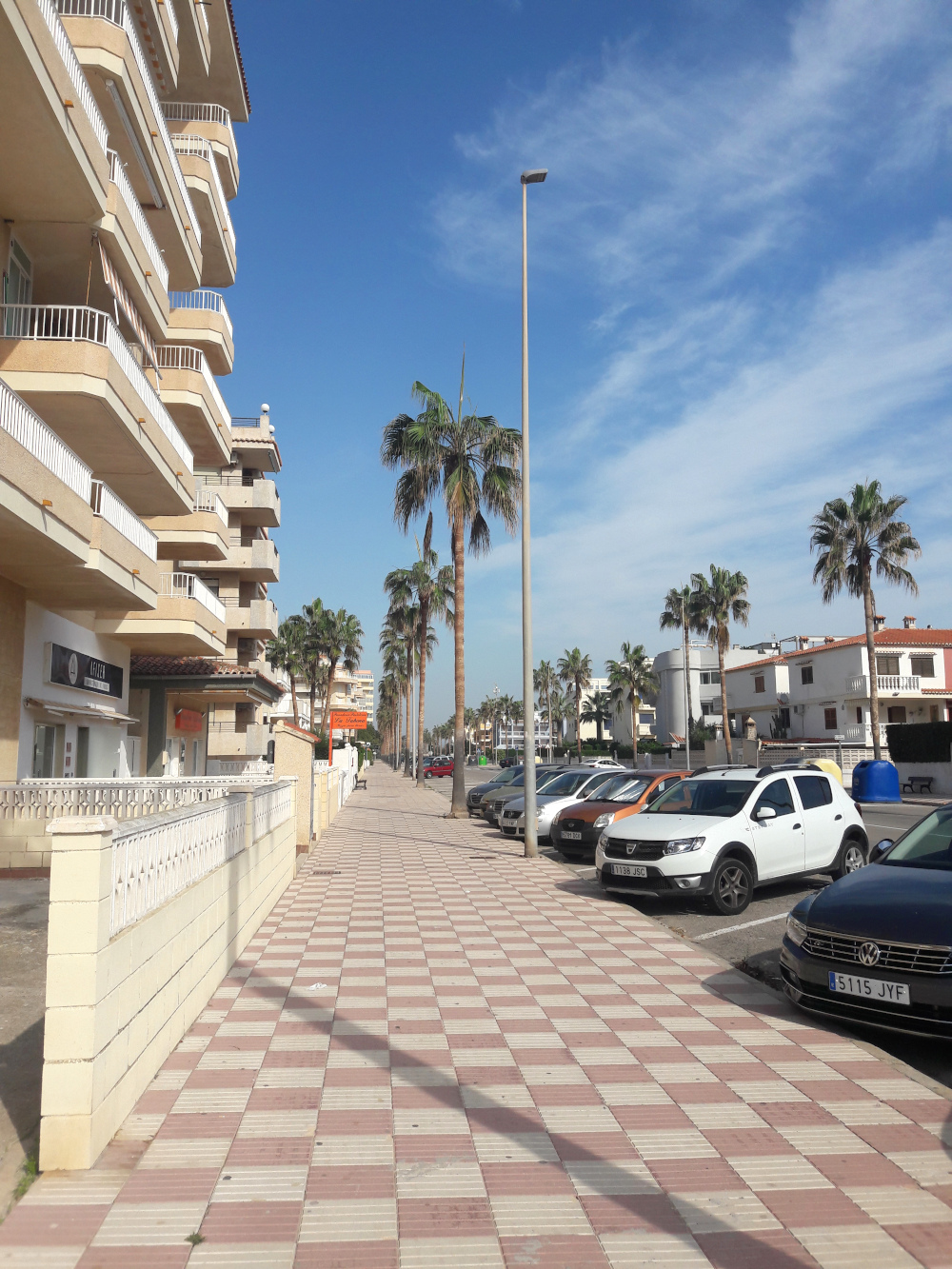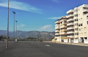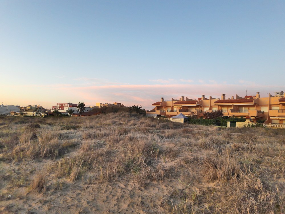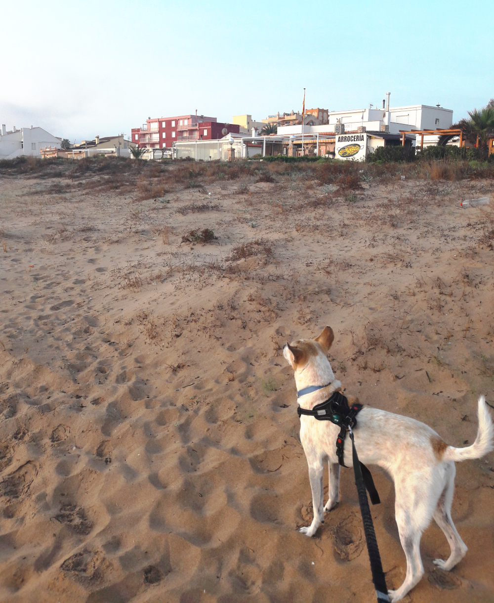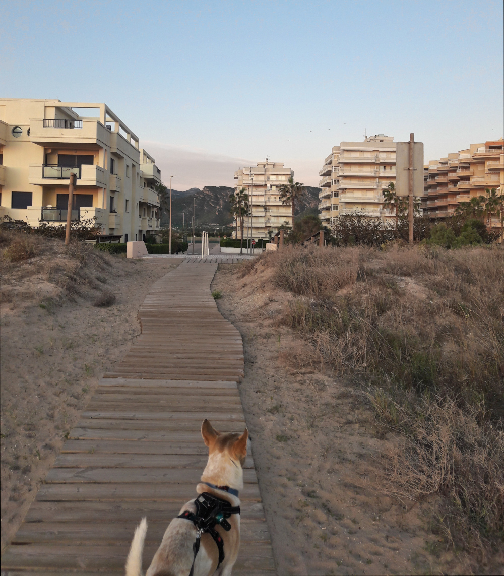 Minua kummastutti tämä rantakaistale taloineen. Tämä ei siis ollut mikään vanha kylä, vaan sen sijaan kaikki talot olivat uuden oloisia rakennuskomplekseja. Eli viljelysten jälkeen oli tämä yhden rannanmyötäisen tien ympärillä oleva paikka, jonka talot olivat korkeita ja parvekkeellisia. Asunnot vaikuttivat loma-osakkeilta ja tyhjiltä sellaisilta. Iltaisin joissain rakennuksissa ei palanut yhtään valoa ja joissain vain pari. Mietimme, että onkohan näitä asuntoja edes saatu myytyä kellekään ja oliko tämä joku todellinen rakennuskupla. Talot oli silti saatu valmiiksi. Ehkä ne olivat valencialaisten, tai jopa madridilaisten, vapaa-ajan asuntoja, joissa käytiin lähinnä kesälomilla elokuisin. Tämän takia Xeracon ranta olisi minun mielestäni oikein hyvä talvenviettopaikka, ehkä sieltä saisi halvalla vuokrattua asunnon talosta, jossa ei asuisi juuri ketään muita. Siellä oli koirapuistokin. Toki omiin kriteereihimme kuuluu oma piha, jolla koirat ja kissa saavat liikkua vapaina. Tällaista omakotiasutusta näytti olevan heti tämän rantakaistaleen pohjoispuolella.