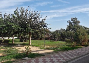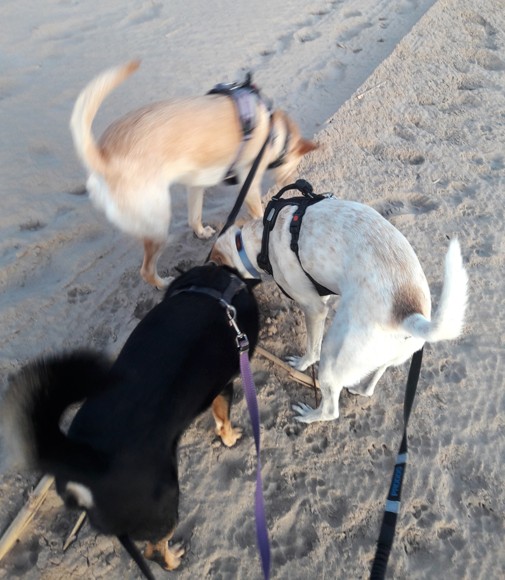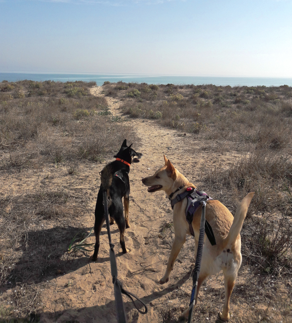 Matka Xeracon rannalle oli kuitenkin toista. Toki moottoritieltä poistuessa oli taas hyvin ihmeellisiä kieppejä ja liikenneympyröitä edessä, mutta navigaattori neuvoi meidät mukavasti Xeracon pienen kaupungin tai kylän ohi. Siinä vaiheessa hieman ihmetytti, kun ajoimme kasvihuoneiden ja viljelysten välisiä teitä – Xeracon kaupungin ja Xeracon rannan välinen tila on valjastettu maataloudelle. Mutta alue oli tasaista ja rantakaistaleen kylä oli avara. Rantaa kutsutaan valenciaksi Platja Xeracoksi ja kastiliaksi Playa de Jaracoksi. Itse asiassa kylä tuntui autiolta. Ja sekös oli minusta mukavaa, kun sai rauhassa mennä koirien kanssa leveää kävelytietä ilman vastaantulijoita.