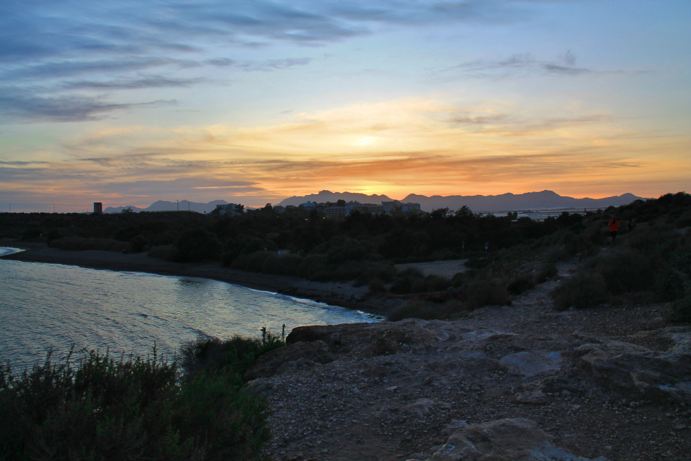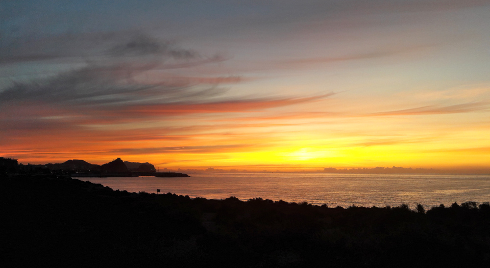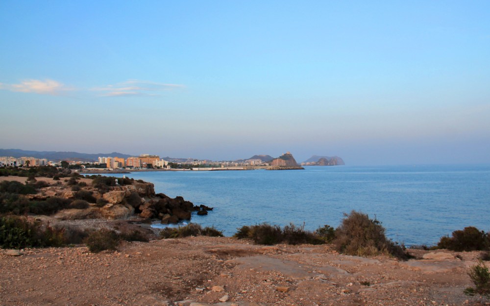 Águilasin alue vaikutti olevan jotain ihan muuta kuin Aurinkorannikko. Siellä oli tyhjää ja avaraa, ei ollut niin korkeita vuoria, mutta silti kumpuilevaa maastoa. Kun katsoin Águilasin kaupungin takaa nousevaa aurinkoa, niin ihmettelin kovasti horisonttia. Oletan, että siellä näkyi kaukana Cartagenan eteläpuolella olevat vuoret. Ne näyttivät olevan aika korkeat ja röpelöiset ja nousevan suoraan merestä. Katselin jälkeen päin kartasta ja arvelen näyn olleen mahdollinen. Muutenkin Águilasin keskustan kohdalla on rosoinen kukkula, jonka päällä on Castillo de San Juan de las Águilasin linna. Siinä vieressä on myös toinen niemi sekä karkeapintainen saari.