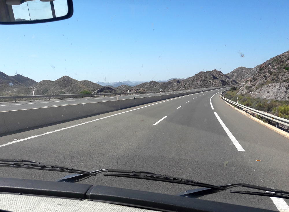 Murcia on pieni Espanjan itsehallintoalue Valencian ja Andalusian välissä ja siellä on myös sen niminen kaupunki. Ajoimme Valenciasta sisämaan reittiä Murcian kaupungin ohi välttääksemme rantatien Torreviejan ja Cartagenan kohdalla, ja käännyimme heti Murcian jälkeen moottoritieltä kohti rannikkoa. Ehkä seuraavalla kerralla haluan nähdä maaston myös Torreviejassa ja Cartagenassa, koska niiden eteläpuolella oli aika jännän näköistä. Toki oli jokin vuorikin, jonka läpi mentiin tunnelissa, mutta muuten oli semmoisia harmaita kumpuja. Vähän semmoista kuumaisemaa.