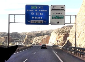 Matkalla Murciasta Andalusiaan katselin uteliaana tätä Espanjan itsehallintoaluetta, josta olisi tuleva meidän seutuamme. Murcian Aguilasin tienoon jännät kuivat maisemat jatkuivat Andalusian puolella, jossa olisi ollut Cabo de Gatan luonnonpuisto. Se on Euroopan kuivin paikka ja kiinnostaisi minua erilaisuudellaan, mutta me kuitenkin ohitimme sen. Emme jaksaneet enää poiketa reitiltämme enkä minä stressata sen suhteen, että millaisia Cabo de Gatan tiet ovat.