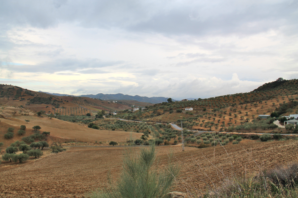 Meidän talon lähellä maisemat ovat mielettömät ja tästä olisi mahdollista kävellä Antequeraan asti tai oikeastaan Santiago de Compostellaan, koska vierestä menee yksi Camino Mozárabe de Santiagon reiteistä. Tietä kävellessä matkanteko tyssää joskus tuulisuuteen ja joskus on edessä ollut jotain irtokoiria, joiden ohi ei oikein päästä.