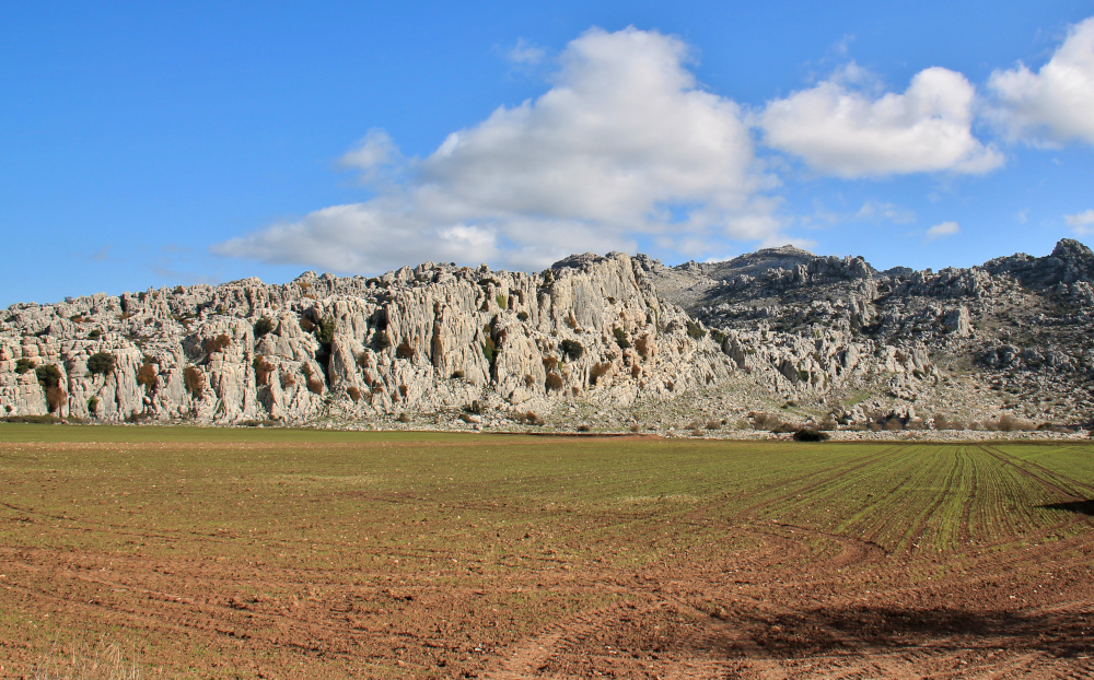 Täytyy sanoa, että iso osa tuosta polusta on melko tylsää etelästä päin kävellessä, koska ympärillä on peltoa. Toki vierellä on vuorta molemmin puolin ja kulkija saa hieman esimakua siitä, millaisia näkymiä olisi poluilla vuoren päällä El Torcalin vierailijakeskuksen luona.