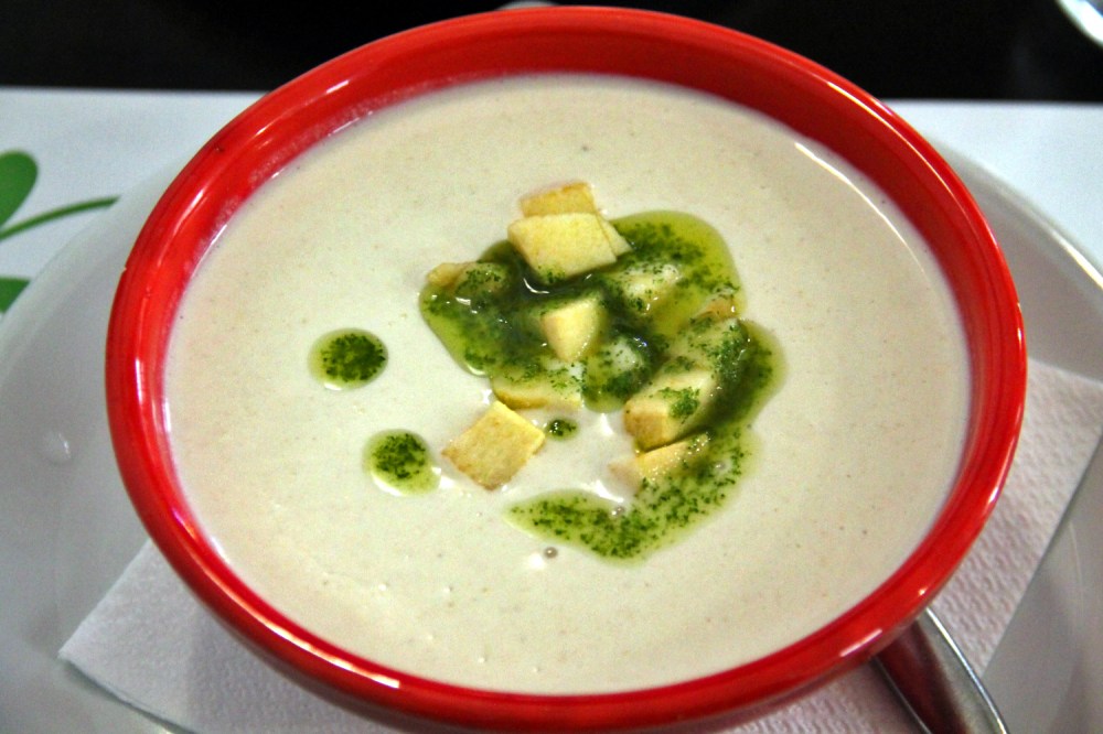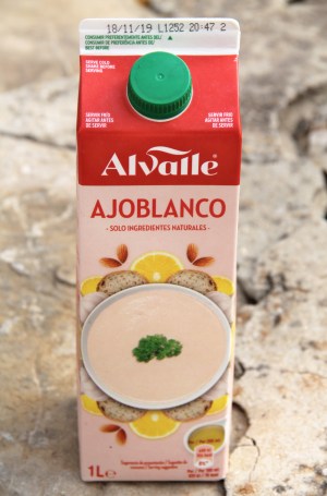 En ole Espanjassa käynyt juuri muualla kuin kasvisravintoloissa ja muut ravintolat olen valikoinut sen mukaan, miten arvelen heidän ymmärtävä mitä kasvisruoka on. Sitähän on vaikea arvioida, koska se riippuu kulloisestakin tarjoilijasta ja kokista. Siispä ensimmäisen kerran maistoin ajoblancoa purkkikeittona. Ostin Carrefourista litran tetran tätä keittoa, purkista kun pystyi helposti tarkistamaan ainesosat. Ravintoloissa se ei niin onnistu. Näin sain tietää, miltä ajoblancon suunnilleen pitäisi maistua, jotta voin yrittää tehdä sitä itse.