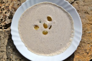 Minä päätin kokeilla ajoblancoa ilman leipää raakavegaaniversiona. Aineksina käytin manteleita (noin 1 dl), omenan, valkosipulia, sitruunamehua ja hieman suolaa. Koska minulla ei ole blenderiä, soseutin nämä veden kanssa sauvasekoittimella. En ikävä kyllä muista paljonko käytin valkosipulia. Vaikka keiton nimi on ”valkoinen valkosipuli”, ei valkosipulin maku ole siinä mitenkään päällekäyvä. Kannattaa siis aloittaa puolikkaalla valkosipulin kynnellä ja lisätä sitä soseeseen maun mukaan.
