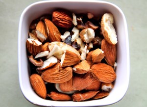 Keitosta saisi kauniimpaa käyttämällä kuorittuja manteleita, joissa ei ole päällä ohutta ruskeaa kuorikerrosta, mutta minä rikoin mantelin kovan uloimman kuoren itse enkä tietystikään ryhtynyt rapsuttamaan ravinteikasta kuorikerrosta pois. Kaupoissa myytävät valkoiset mantelit ovat yleensä kuumakäsiteltyjä.