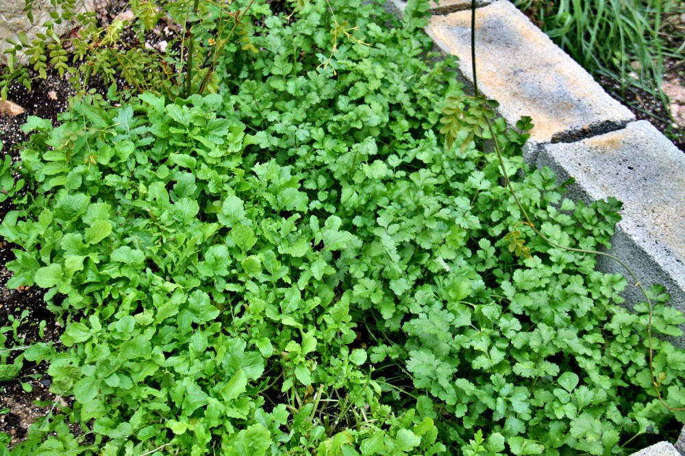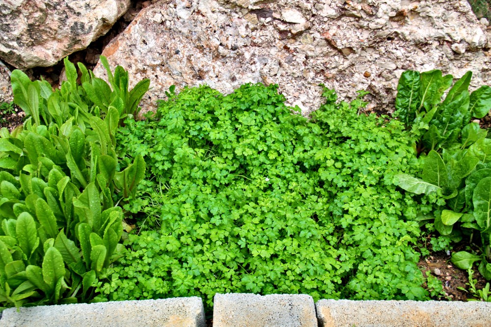 Olen saanut lehtipersiljaa ja korianteria niin paljon, että pilkon niitä suuria määriä salaatteihin. Useinhan näitä käytetään melko pieniä määriä mausteena, mutta ajattelin tabouleh-salaattia, jossa lehtipersilja on pääraaka-aines, ja aloin käyttää näitä yrttejä runsain mitoin. Se toimii ja niiden avulla vihreisiin salaatteihin tulee paljon makua.
