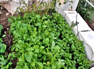 Tuntuu hieman ihmeelliseltä pystyä kasvattamaan salaatteja ulkona keskellä talvea. Olin etukäteen ajatellut kasvattavani vähintään yrttejä ruukuissa. Onneksi talomme takana oli valmiina tiilillä vuorattu korotettu kasvatuspenkki, jossa ei ollut valmiiksi kasvamassa kuin pari pientä jasmiinia ja joku kirkkaan viininpunainen kukka. Ryntäsin siis ostamaan erilaisia helposti kasvavien kasvien siemeniä ja laitoin ensimmäisen erän siemeniä multaan toisena viikkonamme täällä lokakuussa.