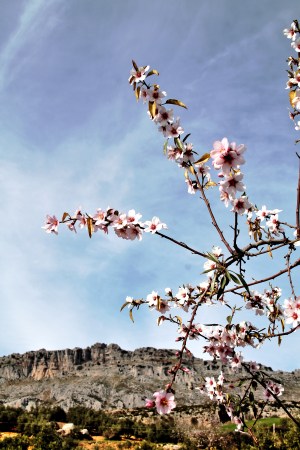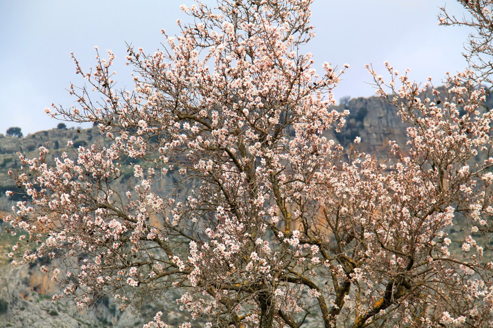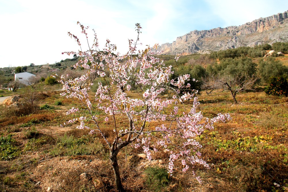 Talvehtimisseudullamme kasvaa lähinnä oliivipuita, mutta joukossa on siellä täällä joitain mantelipuita. En ole saanut otettua kuvia mistään rinteistä, joissa kasvaisi tosi paljon manteleita, mutta tällaiset olisivat ihana näky ja joukolla ne tuoksuisivatkin kunnolla. Jonkin verran näen mantelipuuryppäitä Málagaan menevän A-45 -moottoritien varrella, kun tie kulkee kapeassa laaksossa.