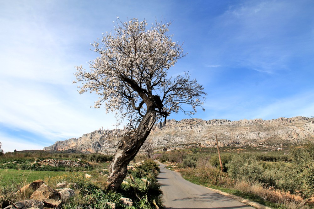 Se taitaa tosiaan olla hyvin jakautunutta täällä, että mitä puita missäkin kasvatetaan. Jossain ihan etelässä Algecirasin seudulla on kai korkkipuita, jossain on kai appelsiinipuita, Axarquiassa nykyisin ainakin avokadoa ja mangoa ja täällä Málagan pohjoispuolella oliivia ja vähän sitten mantelia. En ole minäkään semmoisia kunnon mantelipuulaaksoja päässyt näkemään, mutta kukinnan alettua yllätyin, miten monet tämän seudun puista ovatkin mantelipuita.
