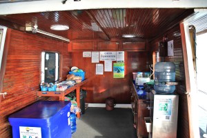 En tiedä onko sukelluskeskusten käyttämien veneiden ruoissa eroja. Aamulla veneen lähdettyä tarjolla on yleensä aamupalaa, ensimmäisen sukelluksen jälkeen on hedelmiä ja toisen sukelluksen jälkeen lounas. Näin myös Lanta Diverilla. Lanta Diverin paattien aamiaisella ei ole juuri mitään vegaanista. Söin vain leivänpäällystevihanneksia ja join pikakahvia itse mukaan tuomani soijamaidon kera. Voisi kai sitä syödä corn flakeseja, kun toisi oman maitonsa. Thaimaassa paahtoleipä ole useinkaan vegaanista, koska siinä on jotain maitojauhetta. Siitä plussaa Lanta Diverille, että heillä on nykyään aina soijaproteiinipaloja lounaan kasvisruoassa eikä kasvisvaihtoehto ole aina vain paistettuja vihanneksia.