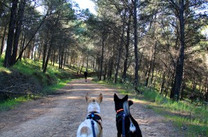 Jos saisi, niin kävisimme melkein joka päivä autolla koirien kanssa kävelemässä makeammissa paikoissa. Nyt tamppaamme samoja teitä tässä lähistöllä. Tuntuu aika tyhmältä, ettei voi lähteä patikoimaan typötyhjiin metsiin. Ehkä täällä Espanjassa luotetaan vähemmän ihmisten tunnollisuuteen kuin Suomessa.