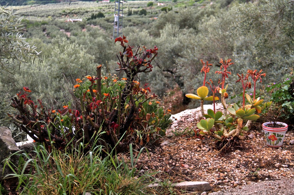 Kallat ovat kukkineet pihallamme noin kuukauden ajan.Kukkiva oliivipuu.Viikunan uudet lehdet ja varmaankin uusia viikunahedelmän alkuja.Mantelipuihin kasvoi nopeasti kukinnan jälkeen isoja uusia nukkapintaisia manteleita kypsymään.Opuntiakaktus ja keltaisia kukkia.Villiparsan versoja. Villiparsa on oikeastikin parsan alkuperäinen versio ja tuon piikikkään pensaan versot ovat syötäviä. Keräilin niitä tontilta ja söin ne heti samantien raakoina.Jokin pensas tai puu ja sen nuput.Violetteja kukkia.Kukkapensas kokonaisuudessaan. Tontillamme ei tosiaan kasva mitään ruohoa, maa on murenevaa ja saviperäistä.Greippi pihamme oliivitarhassa.Joulukuun aikaan oliivitarhassa kasvoi malvaa polvenkorkuisena ja nyt melkein kaikki ovat lakastuneet ja mädäntyneet.Monet malvat kuitenkin kukkivat nyt.Yöllä ja monta päivää ennen tätä oli satanut, joten koirien ulkovällyt olivat märät ja tarvitsi kantaa kuivana pysyvä peti ulos.Jonkinlainen viiniköynnös.
