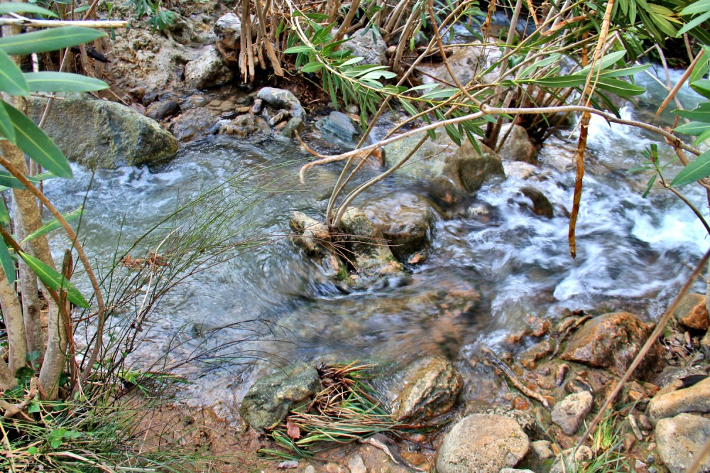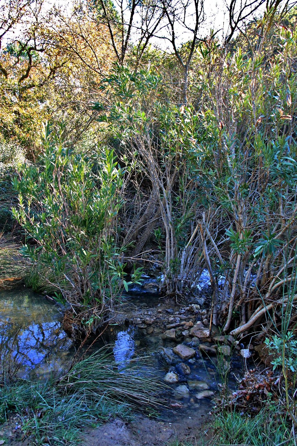 Oleanterijoki. Kuvassa näkyvät pensaat suippoine lehtineen ovat nimen omaan oleanteria.