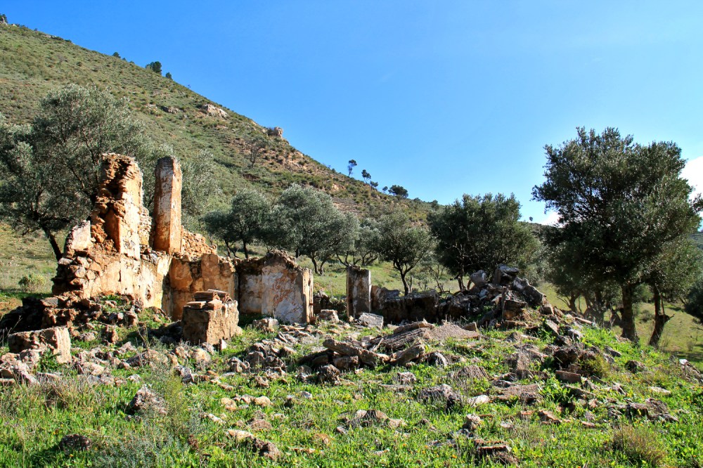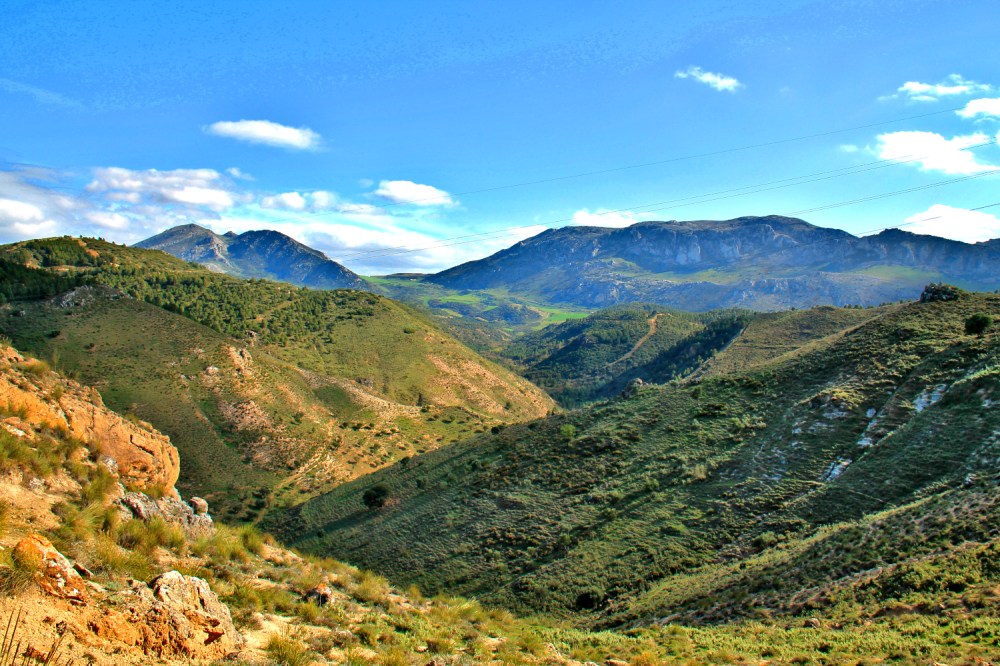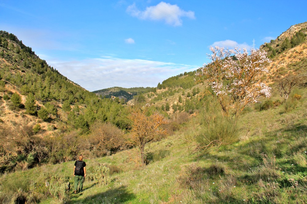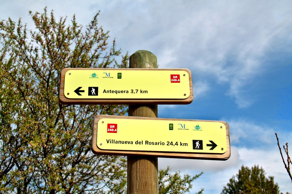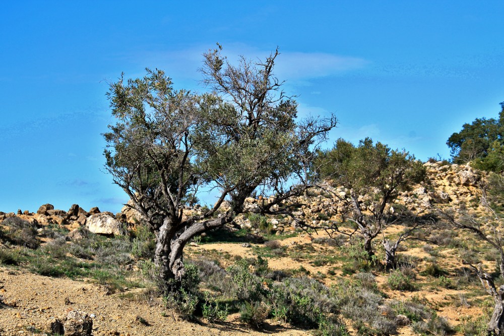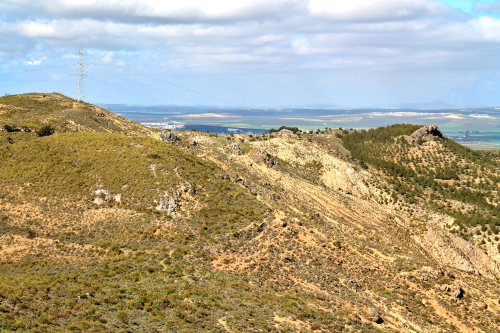 Ylhäällä kukkulan rinteellä kulkemamme polku on tässä merkitty haalean pinkillä. Auton parkkeerasimme karttamme P2-paikalle, josta lähdimme etsimään polkuja pohjoisen suunnalta. Hiekkatie P1-parkkipaikalta P2-parkkipaikalle on huonokuntoinen.Parkkipaikan ohi kulkee Antequeran suuntaan GR 249.4 -polku, mutta se olisi hiekkatie eikä varmaankaan niin mielenkiintoinen. Me sukelsimme pian hiekkatieltä metsään.Metsäpolkujen jälkeen pääsimme tämmöiseen kohtaan, josta näimme polkun menevän harjanteen syrjällä. Vasemmalla oli joku maatila, emmekä joutuneet liian lähelle sitä. Oikealla alhaalla oli Oleanterijoki.