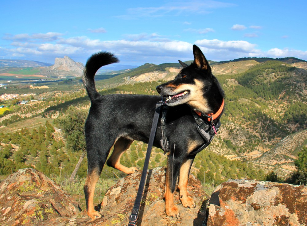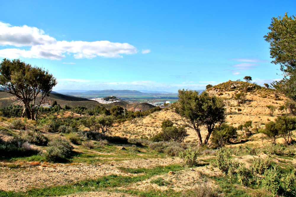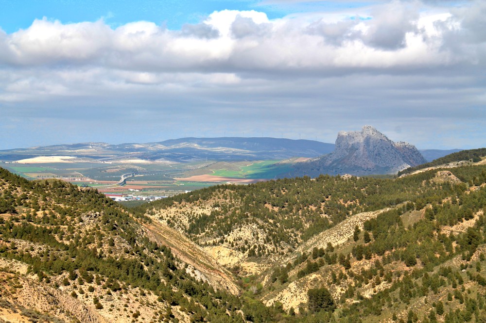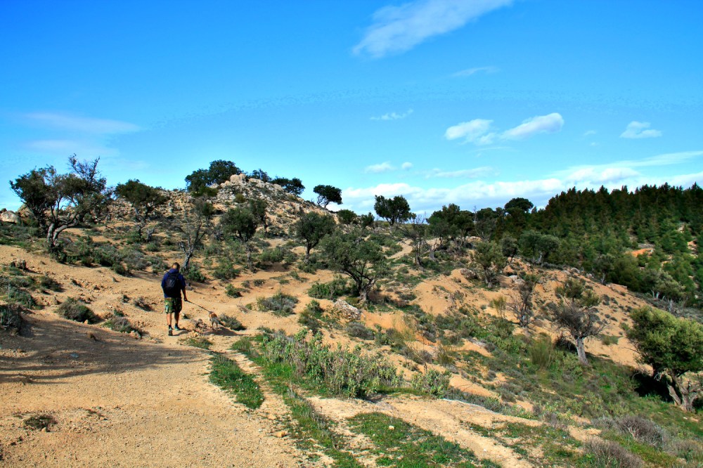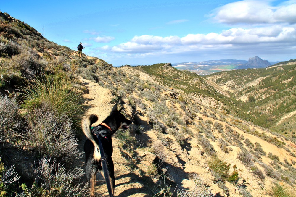 Täältä löytyi tämä nätti villiorkidea.Lexie rinteen polulla.Näkymä polulta Antequeraan ja Rakastavaisten kalliolle (Peña de los Enamorados). Myös nopeiden AVE-junien uudehko nostettu rata näkyy.Tässä on näkymä Antequeran keskustan suuntaan, jossa vihreän kukkulan päällä näkyy valkoinen Ermita de la Veracruz.Polun loppupää, tai ainakin me valitsimme polun, joka meni oliivitarhan läpi oikealla näkyvän aidatun mäntymetsän taakse ja päättyi sinne.Oliivipuut näyttivät vanhoilta.Päätepisteessä pidettiin evästauko.Lexie pousaili taukopaikalla.Taukopaikalla oli huumaava villitimjamien tuoksu. Olen tavannut kaikenlaista yrttiä polkujen varrella täällä ja aina en hajuja tunnista. Tämän sain melko varmasti tunnistettua jälkeenpäin timjamiksi. Rosmariinilla pitäisi olla pidemmät lehdet.Paluumatkalla kuljettiin kohti El Torcal-vuorta, joka on vuori tässä taka-alalla.