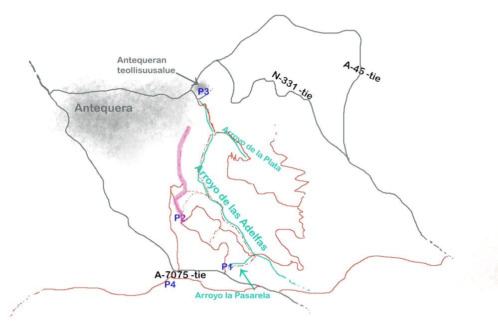 Kuljettu polku näkyy kartassa vihreällä. Lähdimme matkaan Antequeran teollisuusalueelta. Parkkeerasimme Avenida del Romeralille, jossa on paljon tilaa kadun varrella. Arroyo de las Adelfasin ja Arroyo de la Platan risteyksessä ylitimme joen ja lähdimme kävelemään etelään joen länsipuolta.Näkymä Antequeran teollisuusalueelta menosuuntaan, joka on keskimäisen ja oikeanpuolimmaisen kukkulan välissä virtaava Arroyo de las Adelfas. Helmikuun toisena päivänä oli oikein lämmin, jopa kuuma sää.Tämän tien nimi näyttäisi Google Mapsissa olevan Rio de la Villa.Arroyo de la Adelfasin ja Arroyo de la Platan risteyskohdassa on tällainen vanha pato. Takana näkyy Antequera, eli otin kuvan testattuamme ensin polkua, joka lähti Adelfas-joen oikealle puolelle, mutta joka päättyi mehiläispesäpaikkaan. Palasimme siis ylittämään joen, jotta pystyimme kävelemään sen länsipuolella näkyvää polkua pitkin.Joki oli helpointa ylittää patojen alapuolelta.Joen viereistä polkua.