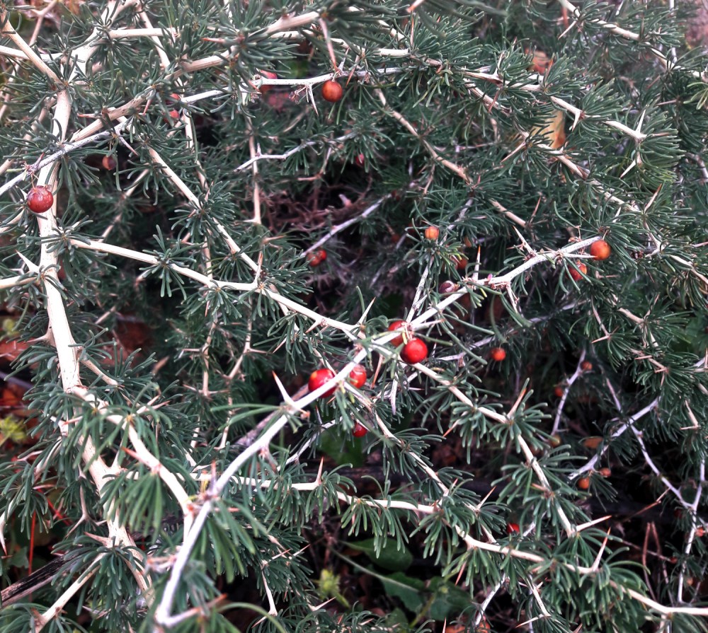 Lisäksi olen ihmetellyt kahta erinäköistä pensastyyppiä. Toinen on kauttaaltaan vihreä, piikit ovat pieniä ja koko pensas on tosi säkkärä. Sen marjat olivat talvella vihreästä tummansinisiksi muuttuvia. Tuo on nimenomaan neulaparsa.