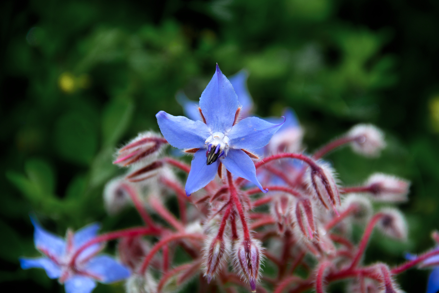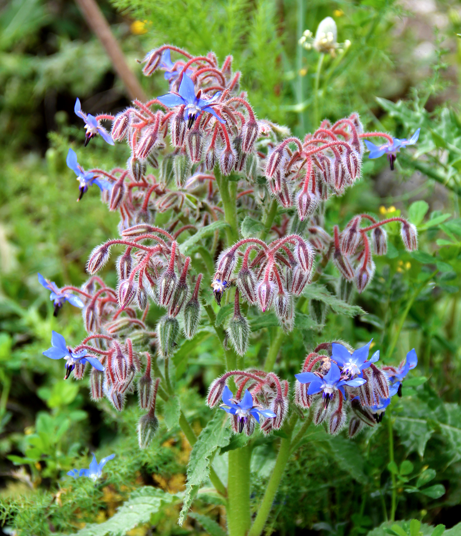 Rohtopurasruoho eli kurkkuyrtti (borago officinalis). Tämän kai pitäisi olla jokseenkin syötävä kasvi kukkineen, mutta toisaalta siinä on jotain epäterveellistäkin. Olen maistanut tämän kukkia ja lehtiä ja niissä on hieman kurkkuinen maku. Karvaisuuteensa takia syöminen ei kuitenkaan tunnu houkuttelevalta, koska karvaisuus on lähellä pienipiikkisyyttä.