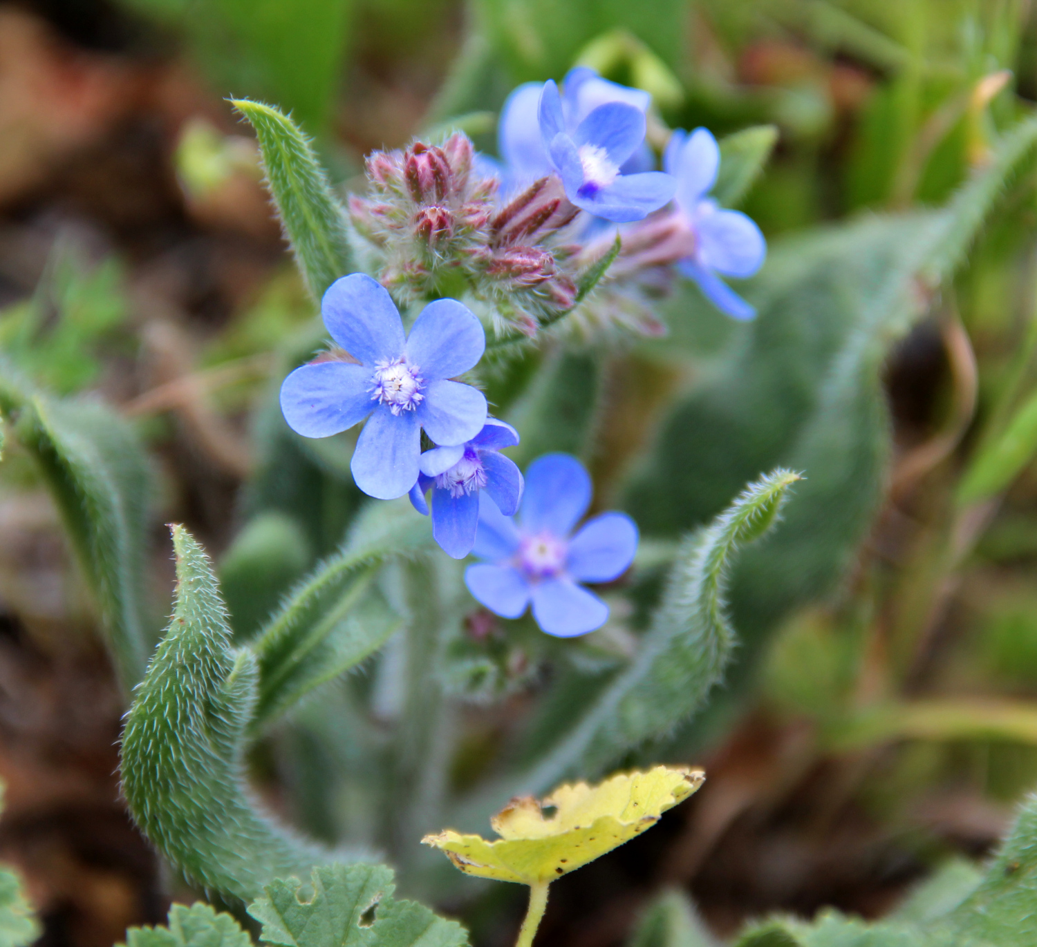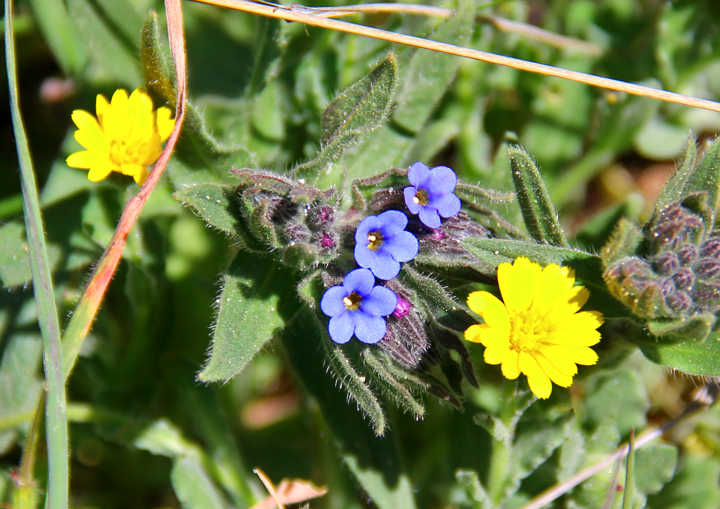 Tämä sinikukkainen kasvi on varmaankin värialkanna (alkanna tinctoria), espanjaksi palomina de tintes. Ajattelin sen myös olevan nunna nonea micrantha, ks. esim. flora.biologiasur.org. , mutta sen sisus ei taida aina olla tällä tavalla kellertävä ja sen terälehtien reunat ovat ehkä aavistuksen epätasaisemmat.