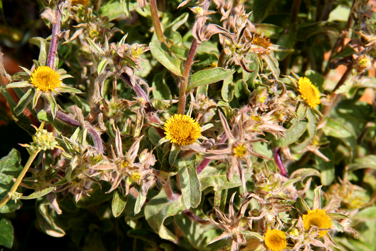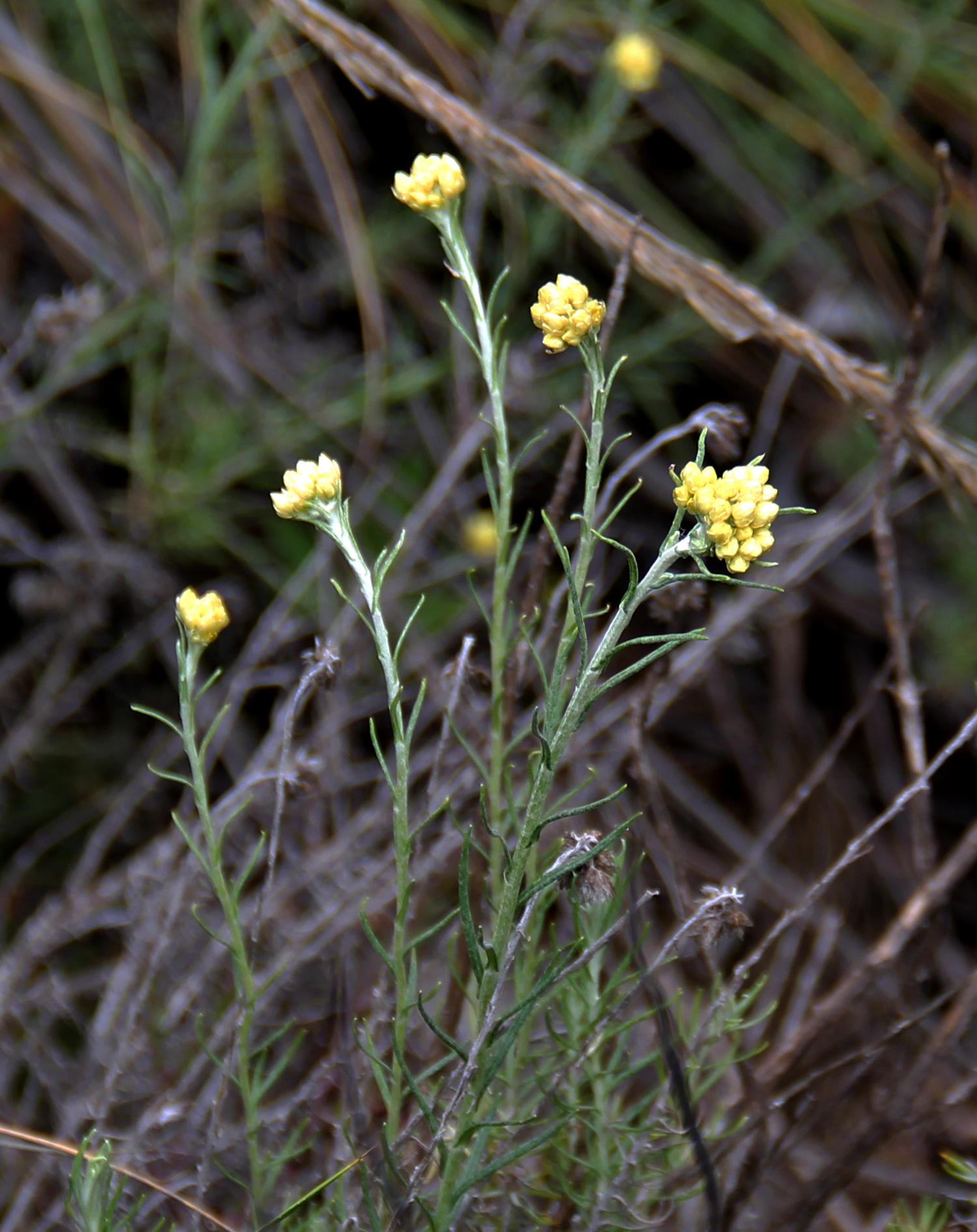Nappiolkikukat Málagan maaseudulla huhtikuussa. Tämä on ehkä ryytiolkikukka (helichrysum stoechas) tai helichrysum rupestre. Sen lehdet tuoksuivat miedosti currymausteseokselle. Helichrysumeihin kuuluu semmoinen kukka kuin Helichrysum italicum, jota englanniksi saatetaan kutsua nimeltä curry plant ja sitä käytetään joskus mausteena. Espanjaksi helichrysumeja kutsutaan nimellä flor de papel ja paperiselta tuo keltainen kukka tuntuikin. Nämä ovat kai vielä vain nuppuja. Kukka kuvataan ja mainitaan viimeisenä sivulla spain-info.co.uk/gardening/wild-flowers/