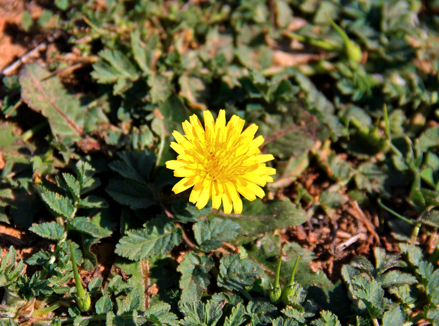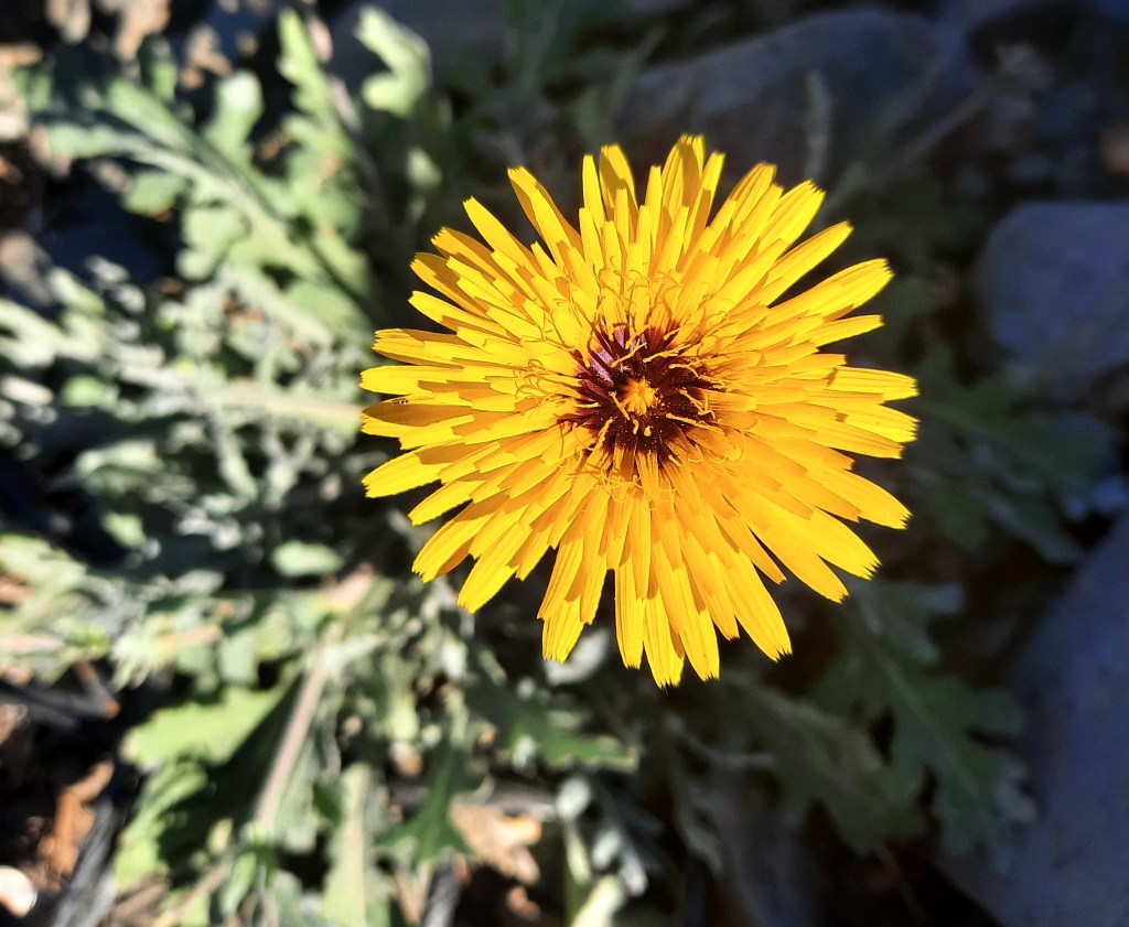 Tämä on kuin voikukka, mutta sen lehdet ovat täällä Suomea pienemmät ja karheammat.