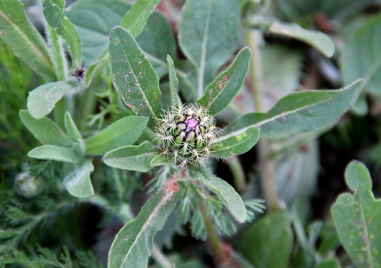 Tämmöiseltä maarianohdake taitaa näyttää ennen violetin kukan puhkeamista. Lehdet ovat tällaiset valkoviirulliset.