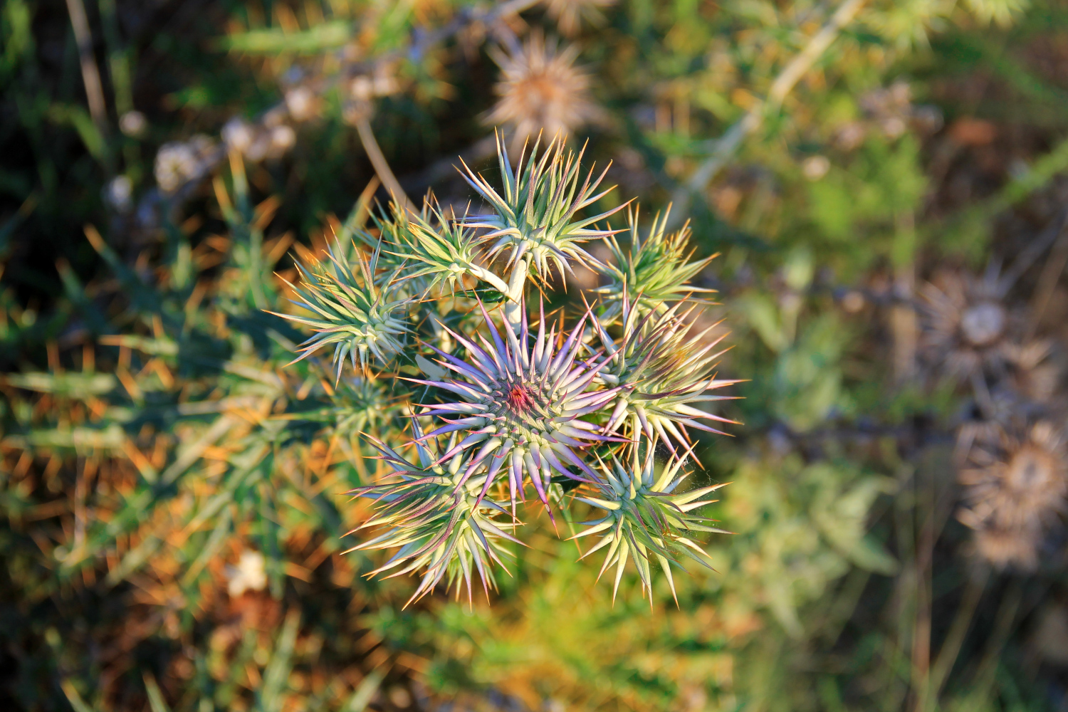 Jännä vihreä piikikäs kasvi, jonka ympärillä on heinäkasveja. Taitaa olla värttinäohdakeatractylis cancellata.