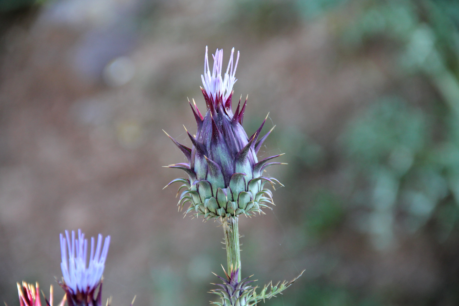 Piikikäs pallo suojaa sisällä olevaa nuppua, josta pitäisi tulla ulos lilan värinen ohdakkeen kukka.