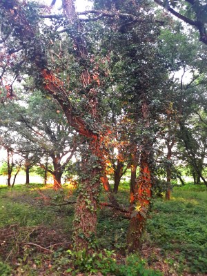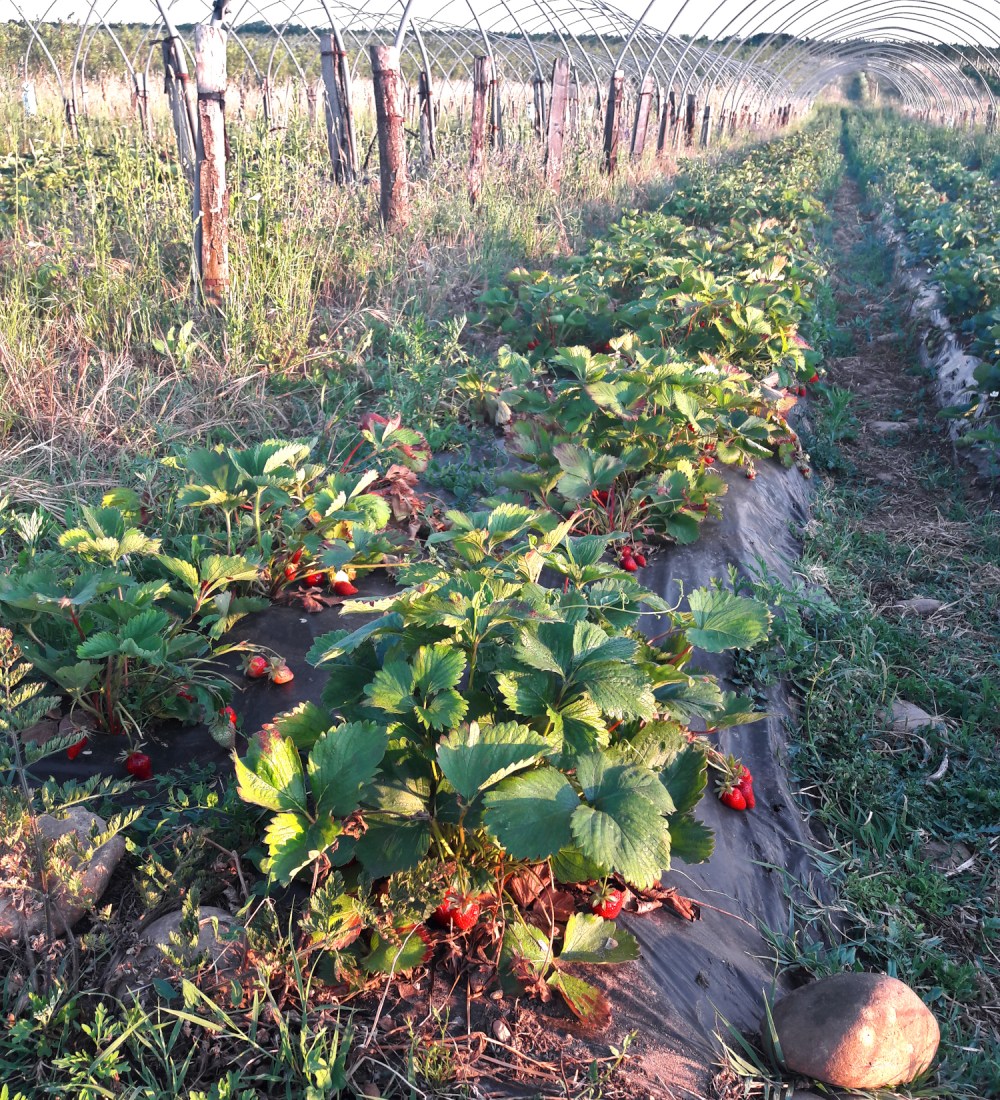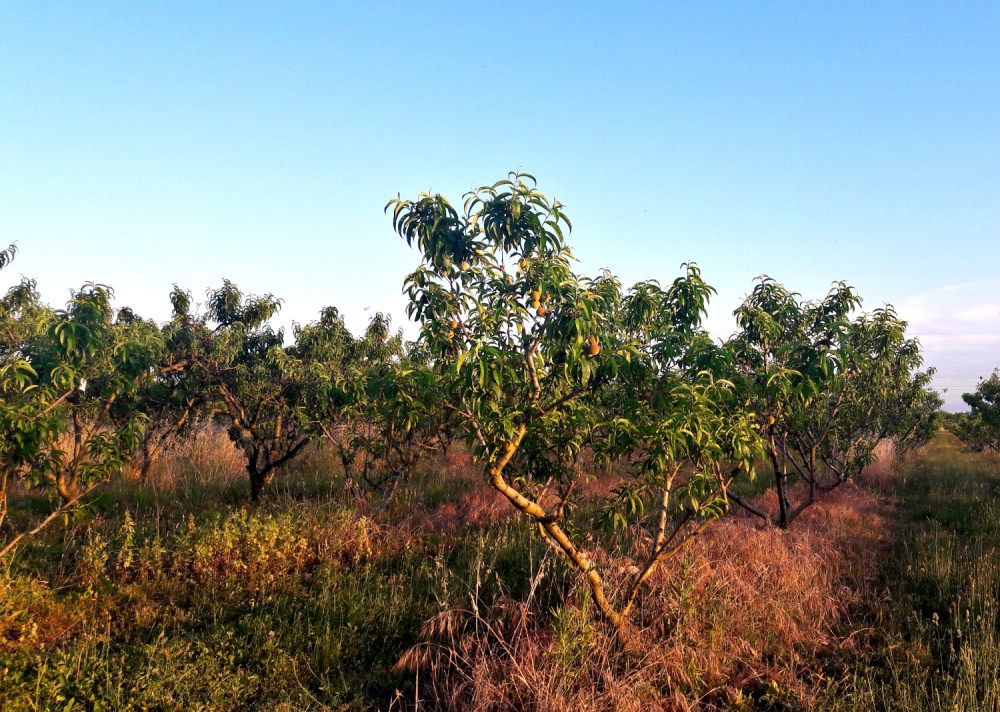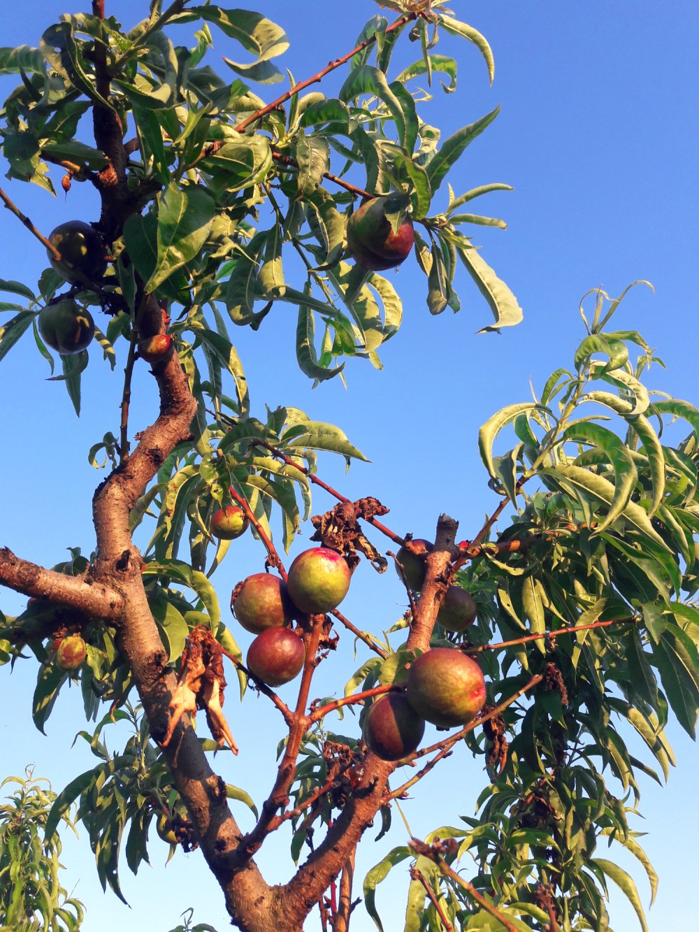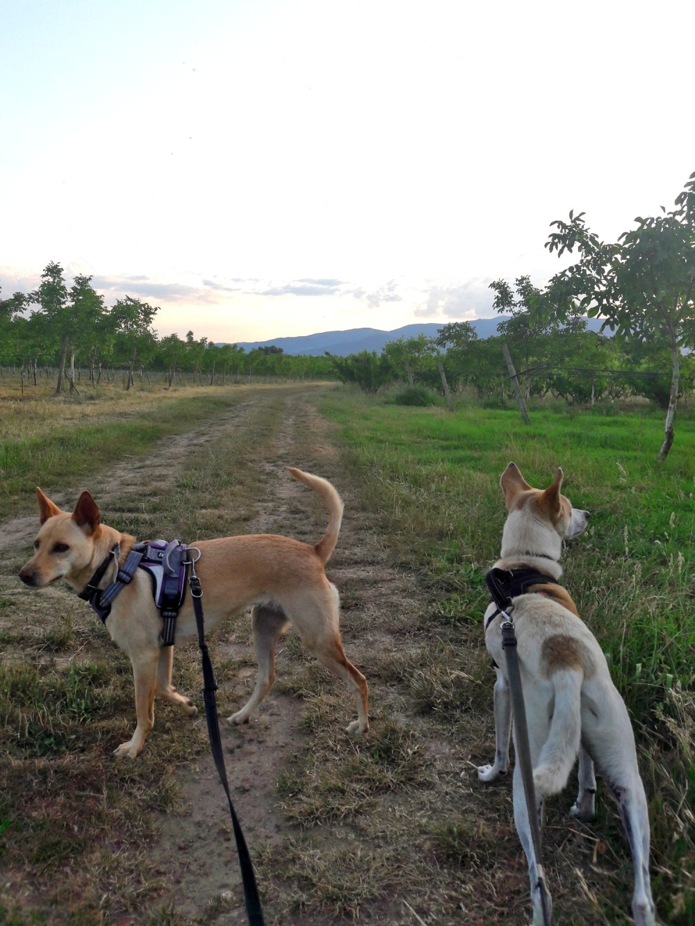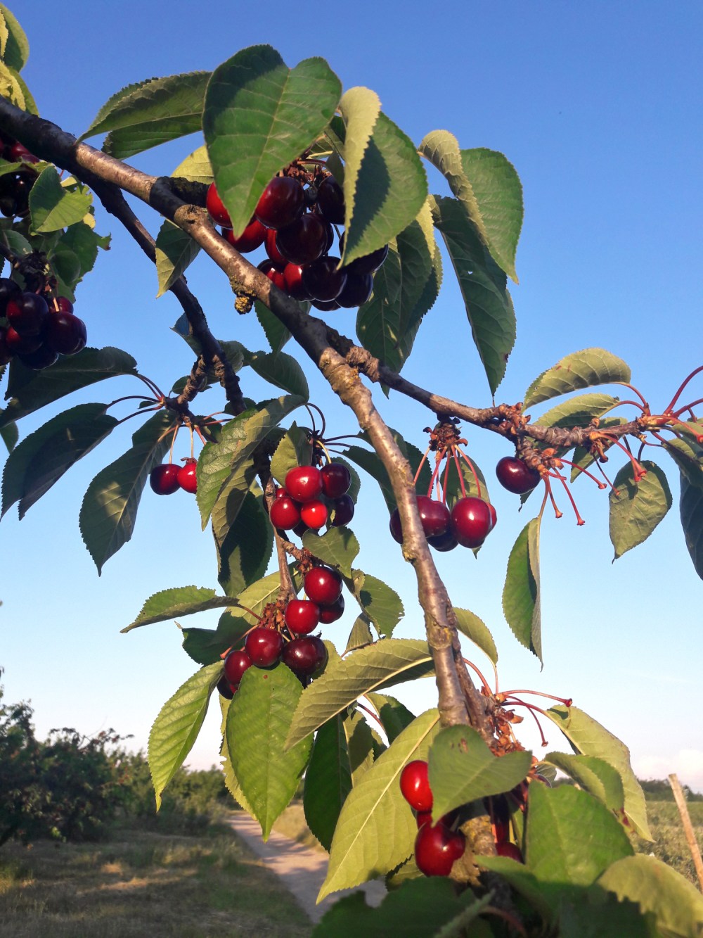 Löysimme Park4Nightista yöksi parkkipaikan pienestä tammimetsiköstä hedelmäpuutarhan vierestä. Siellä oli hyvä ulkoiluttaa koiria ja ihmetellä hedelmäpuita. Siellä kasvoi eniten saksanpähkinäpuita, jotka olivat paljon pienempiä kuin Espanjan talvikotimme vieressä kasvava puu, josta keräsimme satoa syksyllä. Saksanpähkinät olivat nyt kesäkuussa soikeita vihreitä nukkaisia hedelmiä, joiden pinta muistutti avokadoa. Nukkaisuus taas muistutti persikkaa. Tuon pinnan alla kypsyy pähkinän kova ruskea kuori, jonka alle kehittyy pähkinä. Tarhalla oli myös mansikoita, kirsikkapuita ja puita, joiden arvelin olevan persikkaa, nektariinia ja aprikoosia. Tosi jännää aina nähdä, miten hedelmät ja vihannekset kasvavat (lue vierailustani avokado- ja mangotilalla Espanjassa >>).