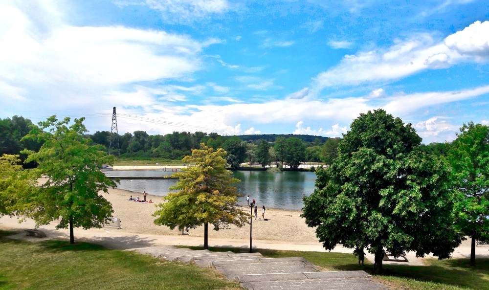 Emme käyneet Brognardin kylässä emmekä muissakaan ympäristön kylissä. Liikuimme vain Étang du Pâquisin järven rannalla. Tuon järven ympäri voi kävellä ja siinä on myös muita järviä, lintujen suojelukosteikko ja kävelypolku, joka näyttäisi saapuvan alueelle jostain muualta ja jatkavan siitä eteenpäin. Hiekkaranta oli kai avautunut yleisölle vasta pari päivää aiemmin ja nyt kuumalla säällä siellä oli uimareita ja auringonottajia. Sitten sää muuttui tuuliseksi ja sateiseksi.