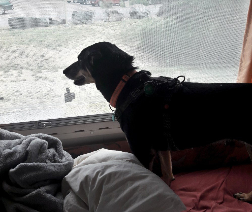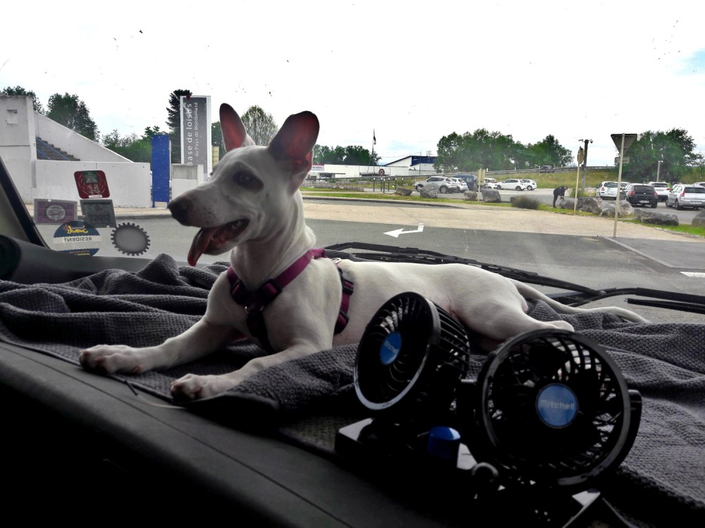 Ajon aikana selasin Park4Nightia etsiskellen sopivaa yöpaikkaa. Emme halunneet iloksemme istuskella auton kyydissä, joten yöpaikat yritettiin etsiä niin, etteivät ne tekisi paljoa koukkausta reittiin. Yksi hyvän oloinen paikka piti diskata, kun arvioissa joku sanoi tien parkkipaikalle olevan vähän jyrkkä. Ranskassa vaikutti olevan Espanjaa paremmin isojen teiden varrella puistoisia pysähdysalueita, aireja. Brognardissa oli Aire de service Campingcar, joka ei ollut ihan tyypillinen aire, vaan enemmmin paikallisten suosiossa olevan järvialueen iso parkkipaikka, jossa oli kolme ilmaispaikkaa matkailuautoille. Siinä olisi saanut viipyä 48 tuntia. Reissun neljännen päivän jälkeen olisin jo kaivannut välipäivän pitämistä tuossa Ranskan yöpaikassa, koska pentujen jatkuva ulos vieminen väsytti. Mutta meillä oli enää lyhyt matka Frankfurtiin, jossa saisimme ja joutuisimme viettämään useamman välipäivän, ennen kuin pystyisimme jatkamaan matkaa. Olimme ajaneet odotettua nopeammin ja pentujen lento Frankfurtista Suomeen oli vasta viiden päivän päässä.