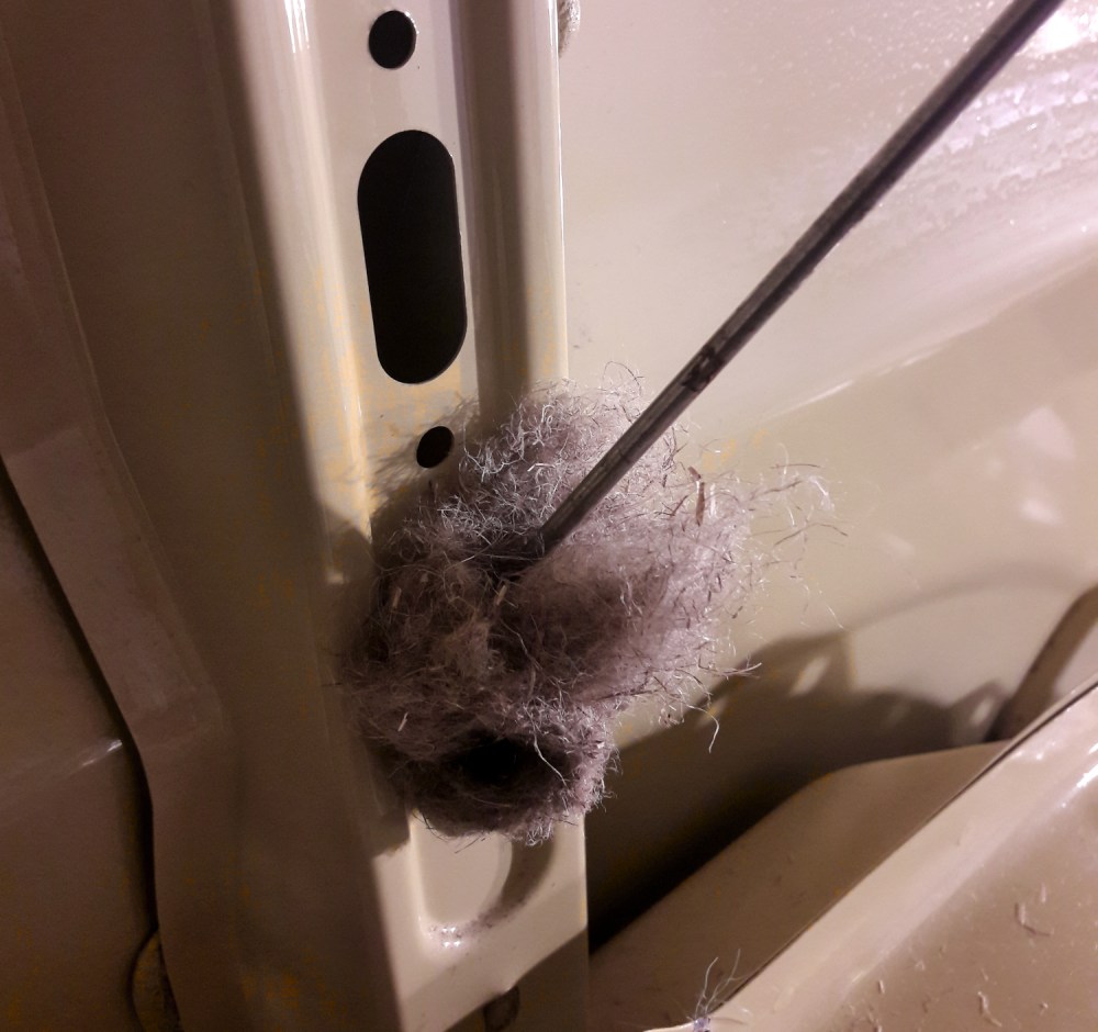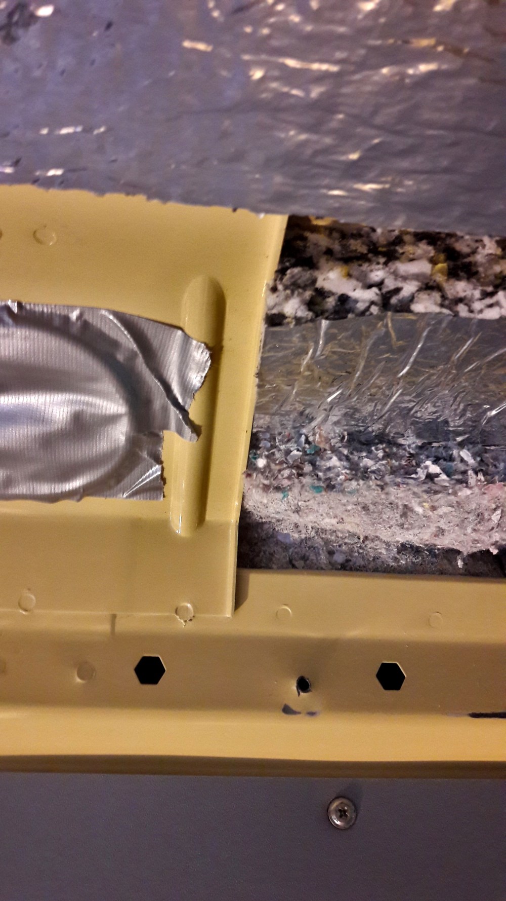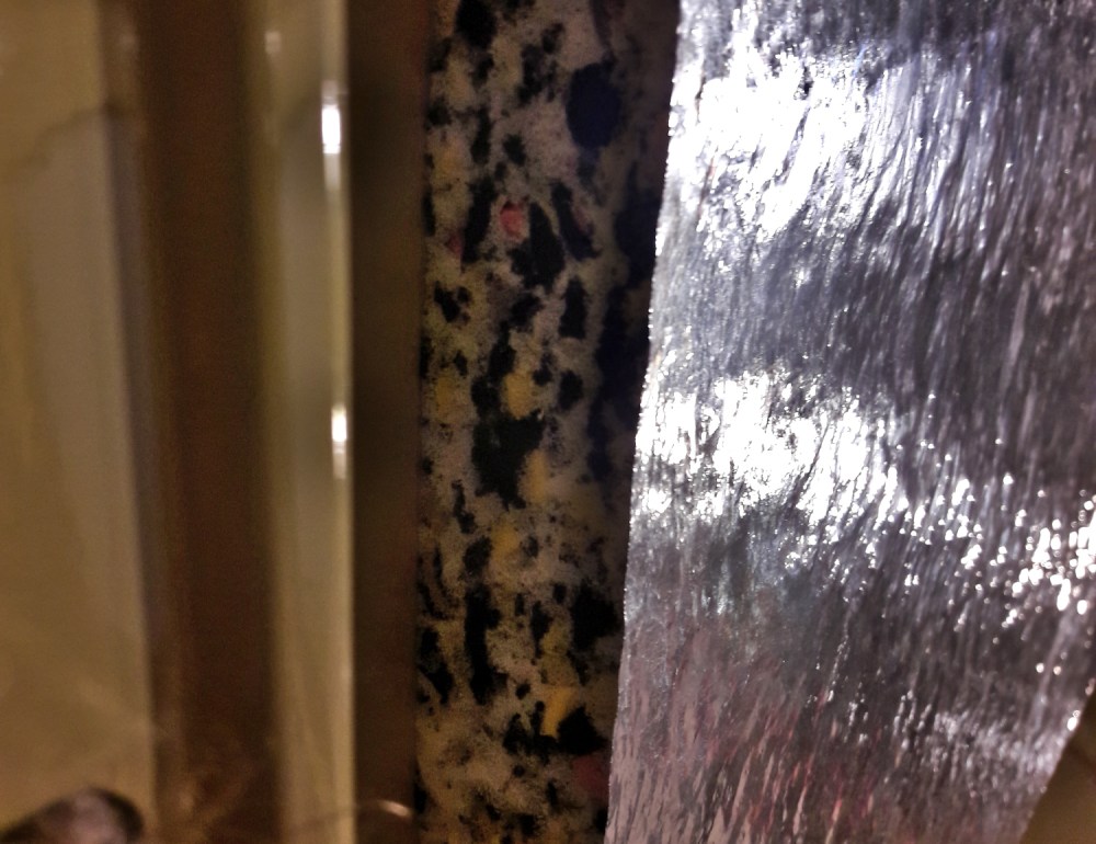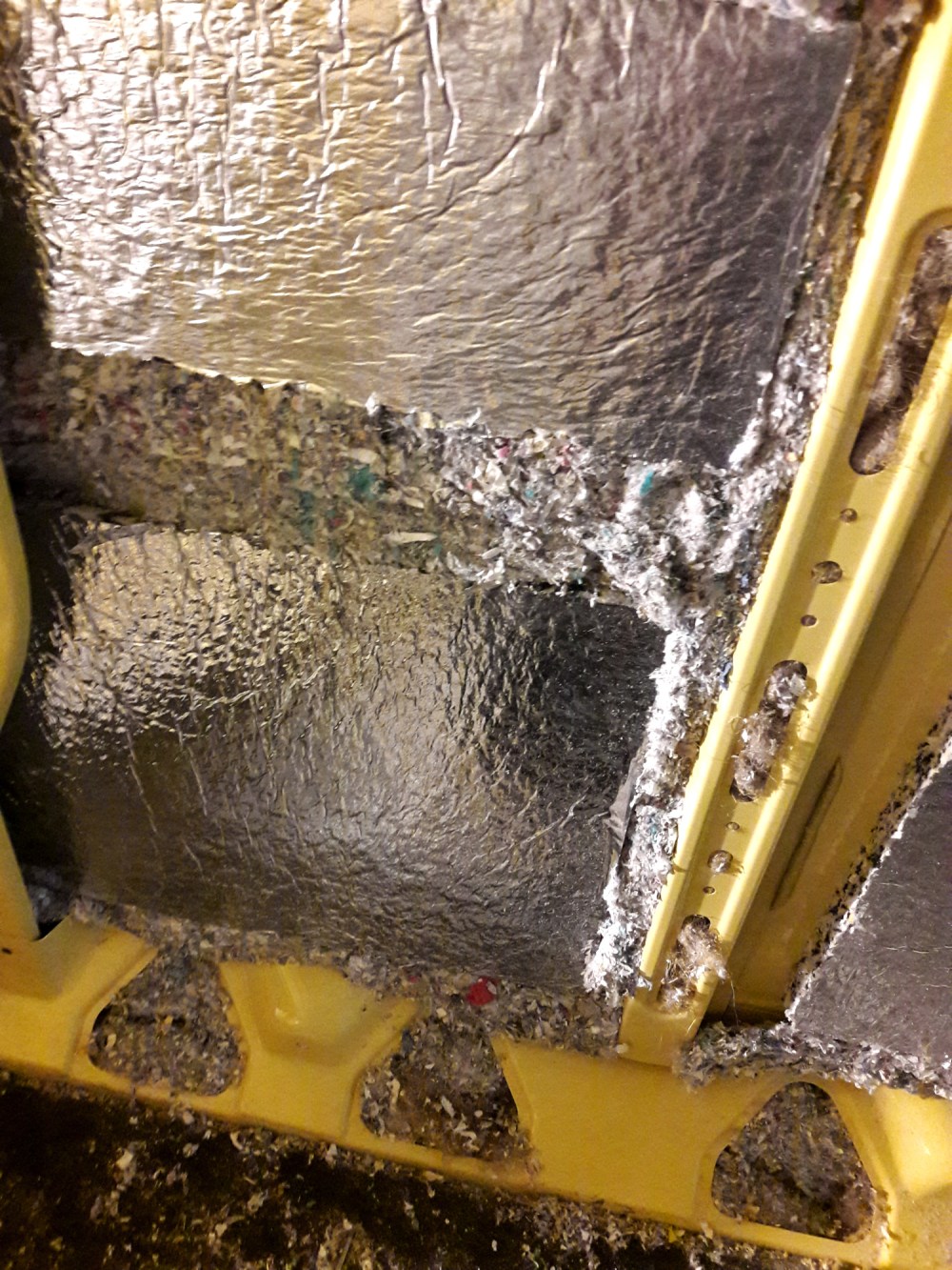 Liukuovi saattaa aiheuttaa aika paljon meteliä tavaratilaan, mutta emme pystyneet eristämään sitä kunnolla äänieristelevyillä tai ekovillalla, koska oven alemmassa puoliskossa on mekanismeja, jotka tarvitsevat liikkumistilaa. Asettelin äänieristelevyä sinne minne sitä pystyi laittamaan ja ihan oven alaosaan tungin ekovillaa. En kuitenkaan laittanut sitä kuin alaosan onteloihin, koska se on hieman pöllyävää materiaalia, enkä uskonut sen olevan hyväksi oven koneistolle.