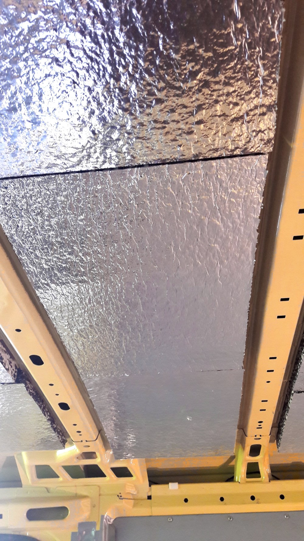 Katto on jakaantunut neljään vaihtelevan levyiseen osioon, joiden välissä on metallipalkit.  Laitoimme äänieristyslevyä vain näiden palkkien välille. Olin ajatellut jättää nämä metallipalkit näkyviin niin, että ne olisi päällystänyt huovalla ja reiät olisi puhkottu mattoveitsellä, jotta voisimme käyttää näitä reikiä, mutta päädyimme sitten laittamaan vaneria kattoon äänieristyslevyjen päälle ja silloin nuo reiätkin peittyvät.