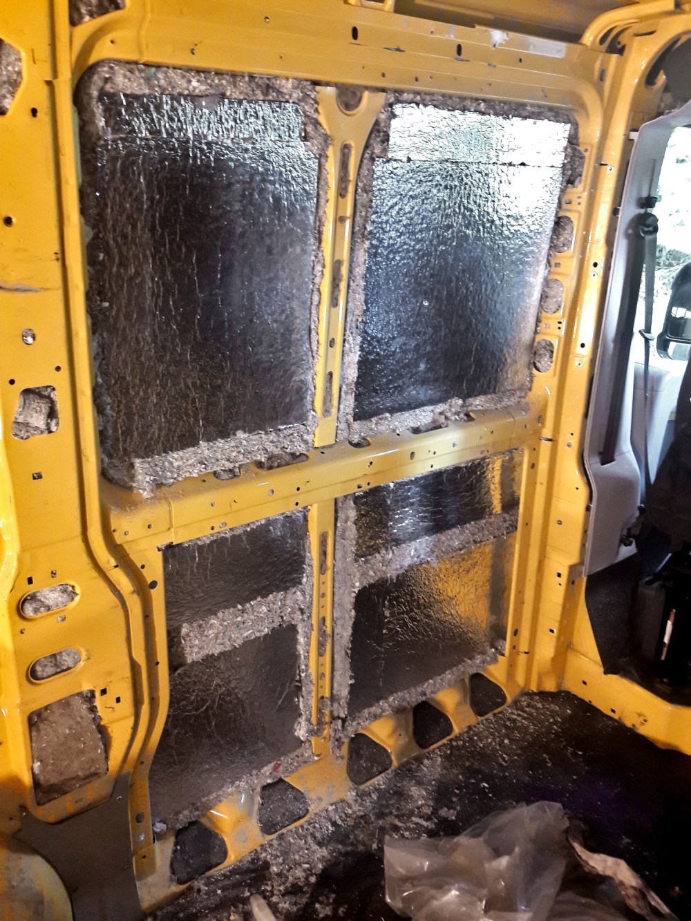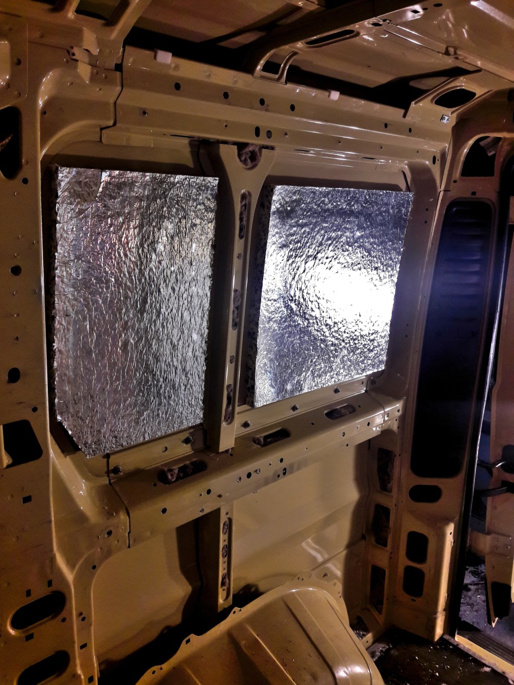 Pakettiauton rakenteissa on paljon pieniä koloja, jotka pitäisi täyttää jollain materiaalilla ääni- ja lämperistyksen vuoksi. Laajoille pinnoillekaan ei saa tungettua mitään tönkköä levyä tiiviisti niin, että se täyttäisi aukot kunnolla reunoja myöten. Siksi jotkut käyttävät ympärillä tiivisteenä esimerkiksi kivivillaa tai spraymaalin näköisestä purkista tursattavaa uretaanivaahtoa, joita me emme kuitenkaan valinneet.