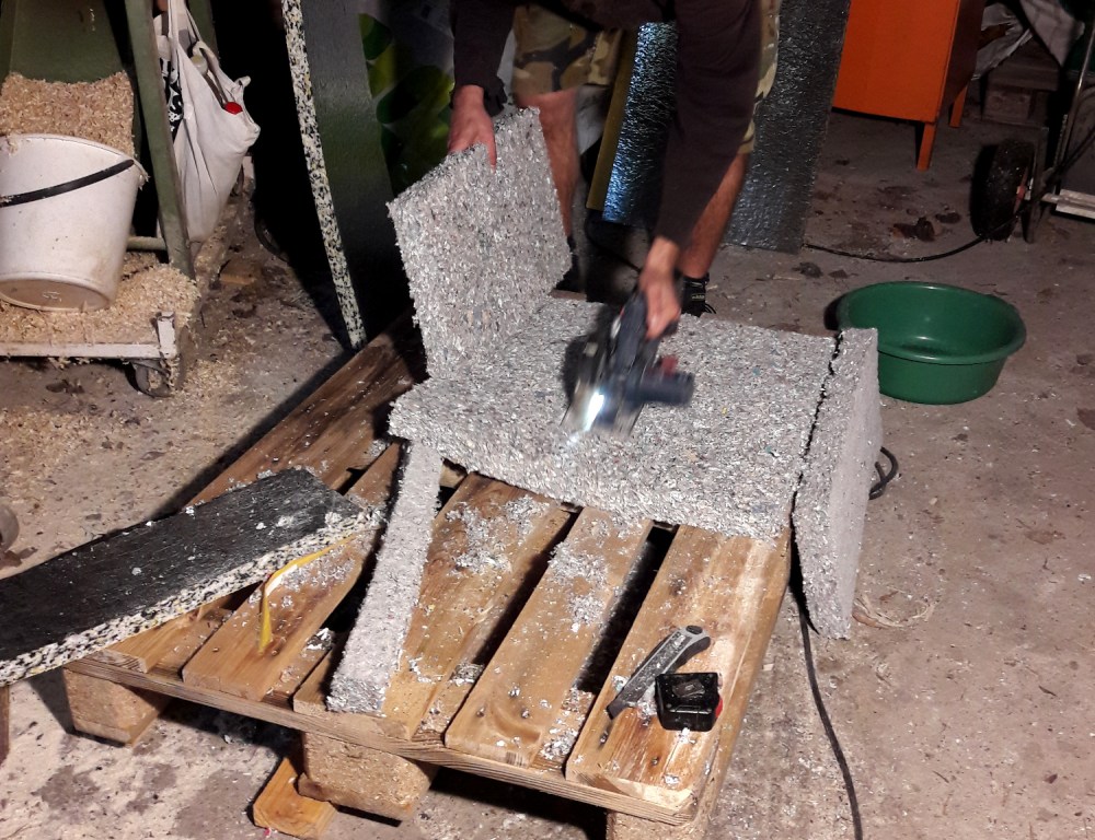 Leikkasimme äänieristelevyt ja ekovillat sirkkelillä. Oli joitain kertoja, kun leikkasimme niitä isolla puukollakin, kun sirkkeli oli muualla käytössä. Ekovillasta myös riivimme paloja pieniin reikiin täytteeksi, ei kaikkia pieniä paloja jaksanut käyttää sirkkelin kautta.