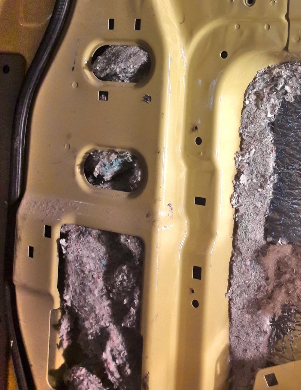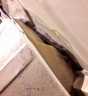Takaovien sisus ennen puhdistusta ja äänieristelevyn palojen liimailua. Tähän päälle ruuvasimme vanerit takaisin paikoilleen.