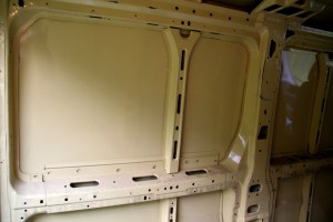 Liukuoven ylempi osa vanereineen oli siitä erilainen, ettei siellä auton uloimman pellin ja vanerin väliin jäänyt  yhtään tyhjää tilaa, kun taas seinissä oli kaikenlaisten ulokkeiden takia monta senttiä pellin ja vanerin välissä väliä, jonka täytimme nyt siis äänieristelevy- ja ekovillakerroksilla. Nyt laitoimme liukuoveen äänieristelevyä, mutta emme ekovillaa. Keskelle pitää ruuvata kiinni laudan pala, johon vanerin saisi ruuvattua kiinni, koska nyt vaneri ei enää ole kosketuksissa alkuperäisiin ruuvikoloihin.