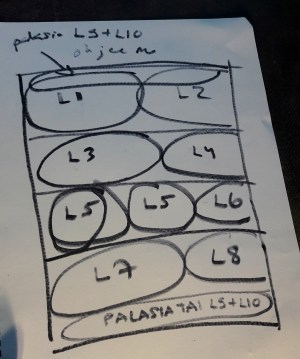 Suunnittelin tällä tavalla miten äänieristelevyjä voisi kattoon laittaa (L1=levy 1 jne.). Ei näitä laitettu ihan juuri näin. Monista levyistä jäi jämäpaloja, ja niitä laitettiin etenkin katon rajaan.