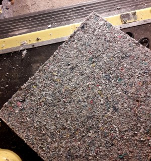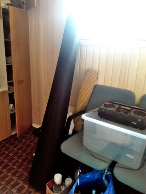 Meillä oli tällaista verhoilumattoa toisen rengaskotelon päälle, toiseen sitä ei riittänyt enkä vielä tiedä mitä siihen toiseen laittaisi. Mielestäni eristelevypalasten päälle ei olisi suoraan voinut liimata verhoiluhuopaa, koska eristelevykerros oli niin rosoinen. Tämän maton päälle tulee siis vielä harmaata verhoiluhuopaa tai sitten vain puusta rakennettava kotelo. Oli vaikea saada leikattua tästä matosta sopivan kokoisia paloja rengaskotelon peittämiseksi, koska kotelo on hankalan muotoinen. Sprayliiman käyttökään ei ole ihan simppeliä  – sitä pitää ensin suihkuttaa sekä kiinnityspinnalle että palaan, sitten pitää odottaa muutama minuutti ja sitten asettaa pala paikalleen. Nyt osaan asennoitua siihen, että verhoiluhuovan laittaminen ei tule olemaan helppoa.