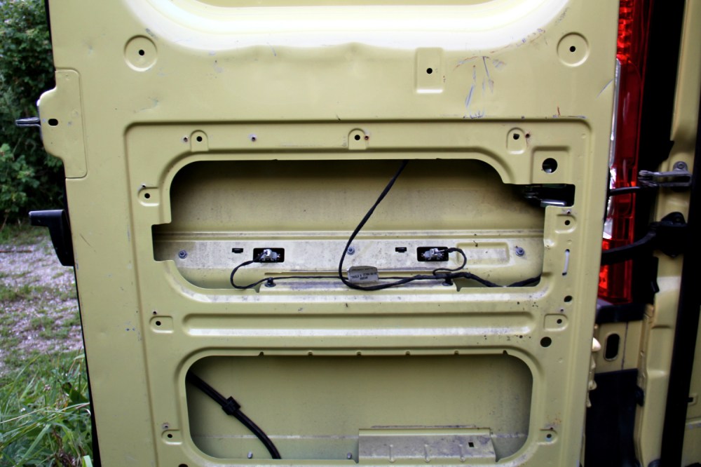 Takaovien sisässä kulkee piuhoja, jotka piti ottaa huomioon eristelevyjä lätkiessä. Käytännössä laitoimme takaovien sisään äänieristelevyä pieninä (esim. 10 X 30 cm) paloina, jotta ne eivät olisi näiden piuhojen tiellä. Ekovillaa laitoimme sisään vain jonkin verran. Halusimme varautua siihen, että näihin johtoihin tarvitsisi joskus päästä käsiksi, jos jokin (esim. rekisterikilven valo) menee epäkuntoon.