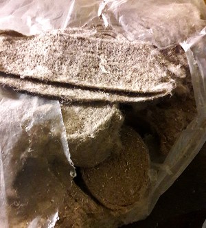 Meillä sattui olemaan valmiiksi pellavarivettä (tai pellavanauhaa), jota on käytetty hirsien välissä. Tungimme sitä reikiin ekovillan ohella ja peitimme sillä joitain epätasaisia seinäpinta-aloja.