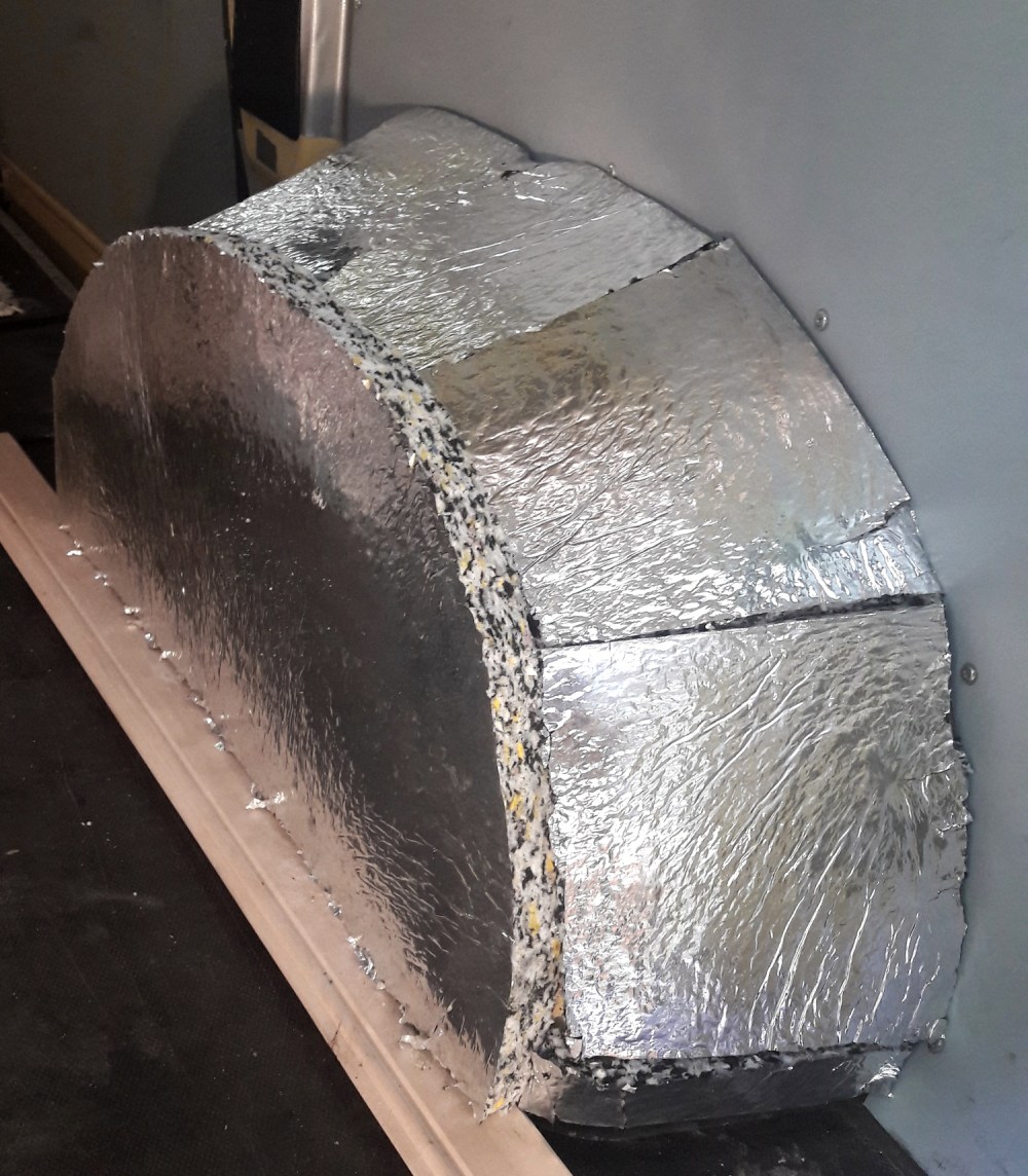 Kotelot päällystimme 20 mm paksuisella äänieristyslevyllä. Vaikka se oli ohuempaa kuin muualla autossa käytetyt levyt, ei se kuitenkaan taipunut kunnolla koteloiden päälle, joten päädyimme leikkaamaan siitä palasia. Varmaan jos olisimme leikanneet siitä yhden ison palan kotelon päälle, ei liima olisi kuitenkaan pitänyt palaa paikallaan kotelon myötäisesti.
