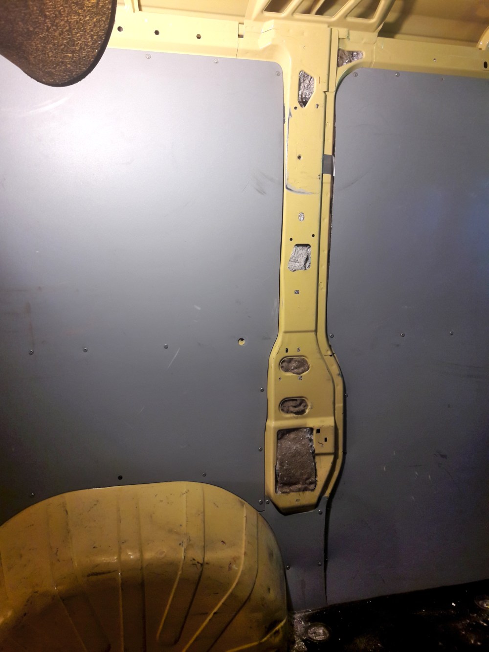 Fiat Ducaton tavaratilan seinissä on tällaisia painaumia ja kaikenlaisia pikku koloja. Ne tarvitsee täyttää eristeillä. Isojen pintojen päällä oli vanerit, jotka irroitimme ja laitoimme takaisin eristeiden laittamisen jälkeen.